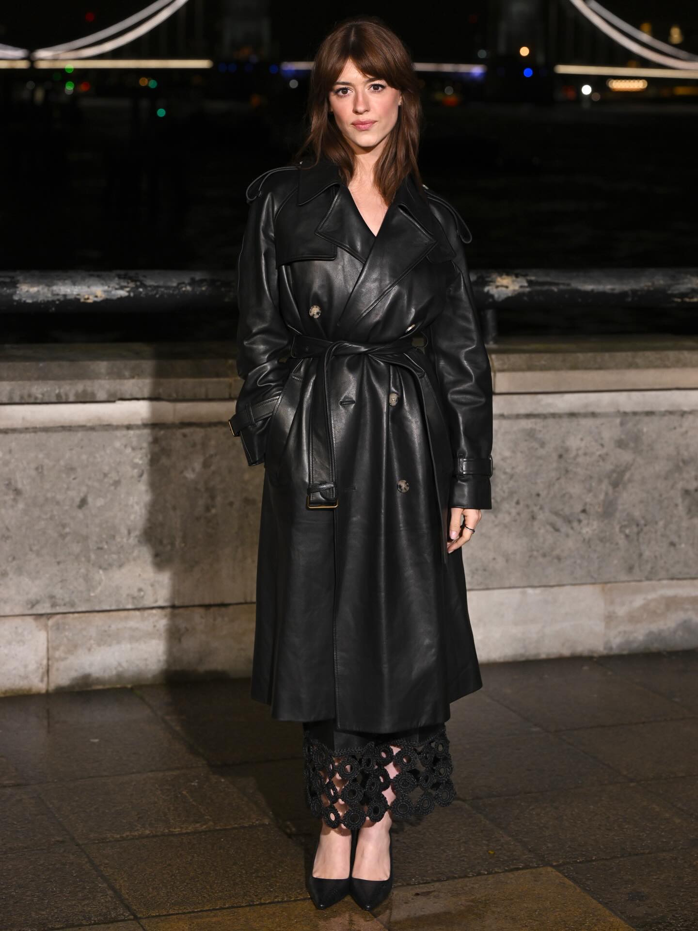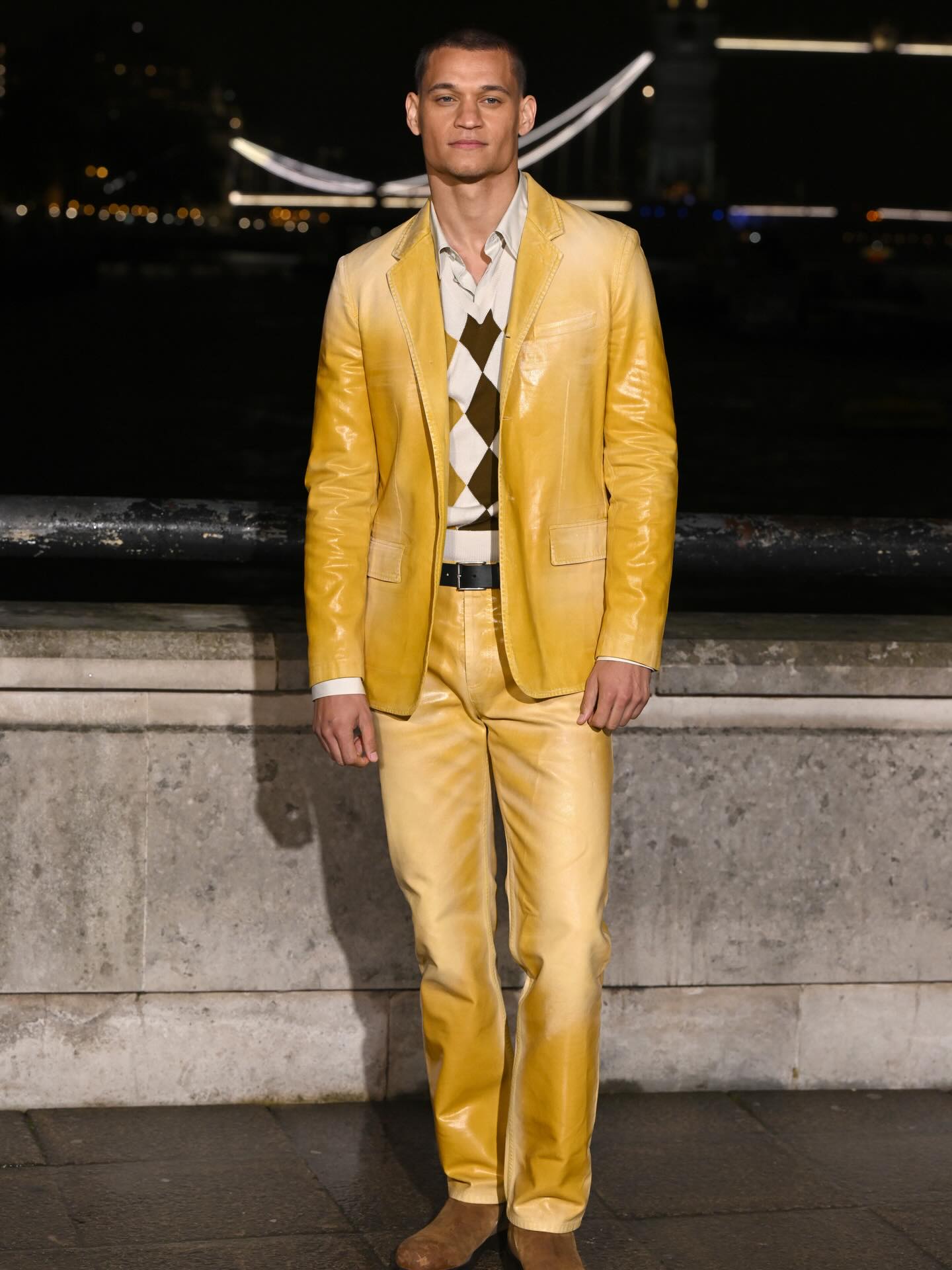 الحدث استقطب أيضاً نجوماً من عالم الدراما البريطانية، من بينهم سيمون آشلي ولوك طومسون، بطلا مسلسل Bridgerton اختياراتهما اتسمت ببنية واضحة وألوان داكنة غنية، في انسجام تام مع أجواء العرض الليلية. سيمون تأنّقت بمعطف من الجلد البنيّ نسّقته مع كندرة مدبّبة وحقيبة من الجلد الأسود، فيما ارتدى لوك سروالاً من درجات البنيّ الداكن مع قميص بنمط المربّعات وترنش كوت بلون سرواله.
