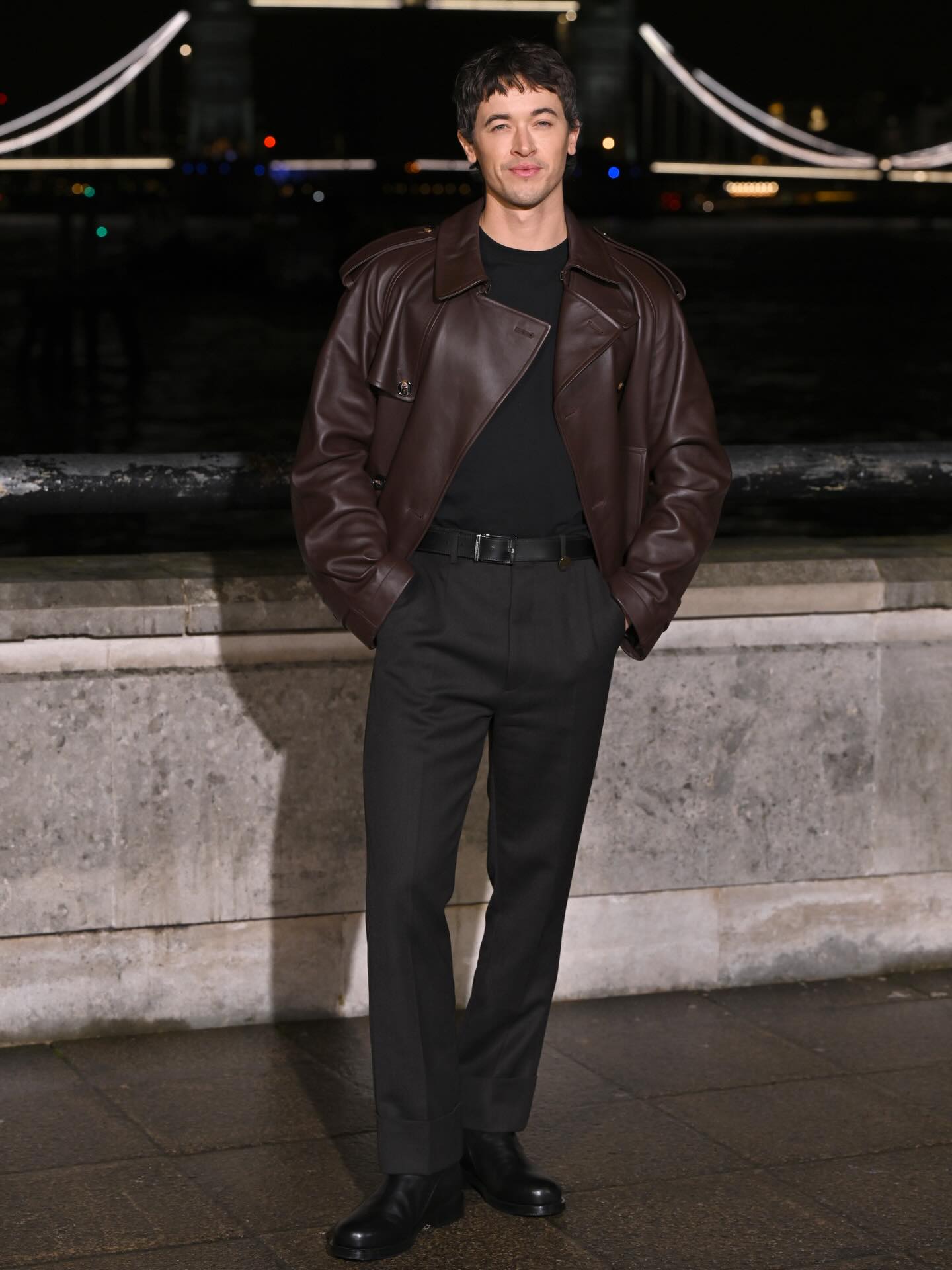 النجم الشاب توم بليث بدا أنيقاً بأسلوب عصري، حيث تألّق بسروال وتوب سوداء مع سترة قصيرة من الجلد البنيّ.