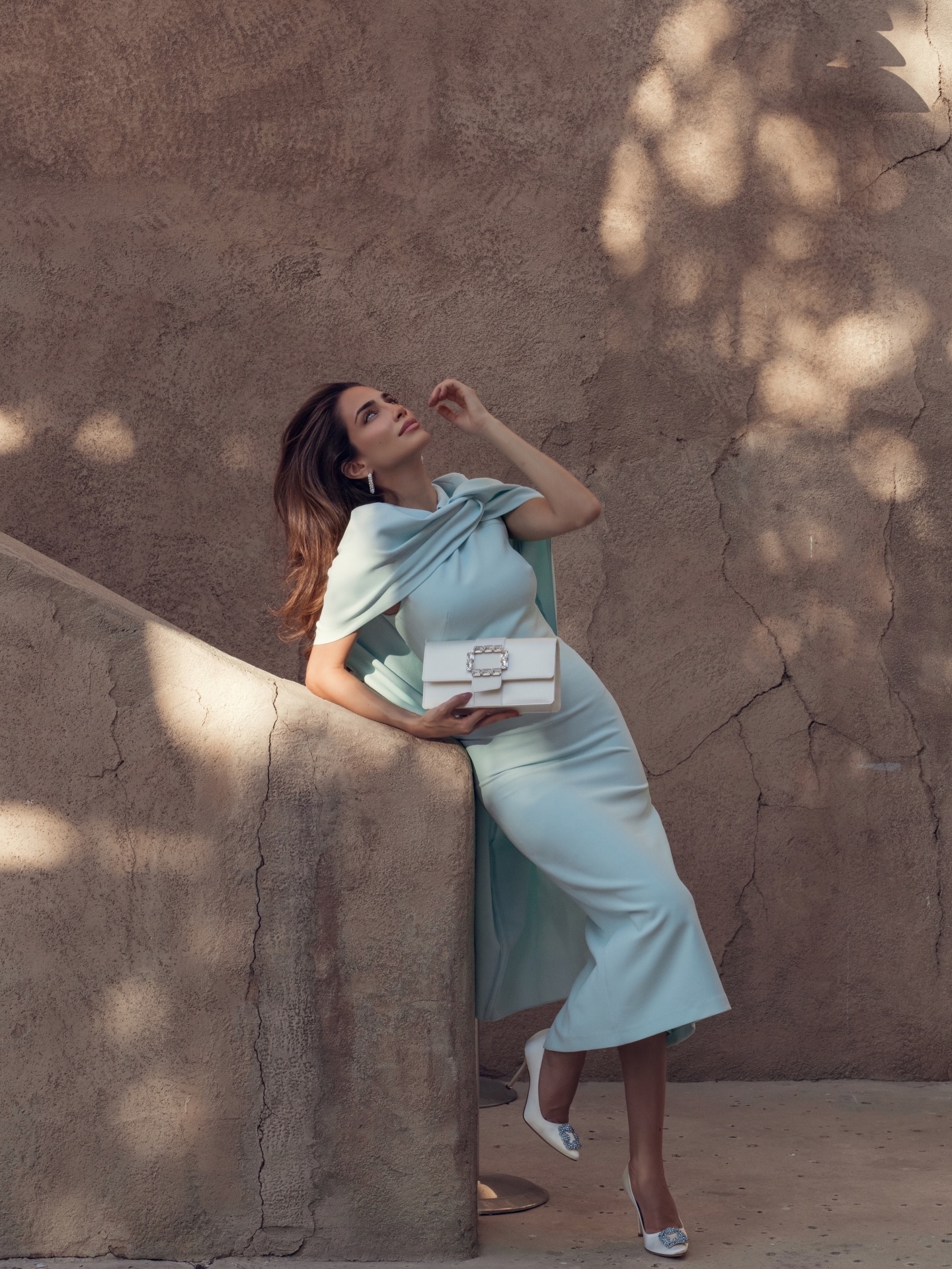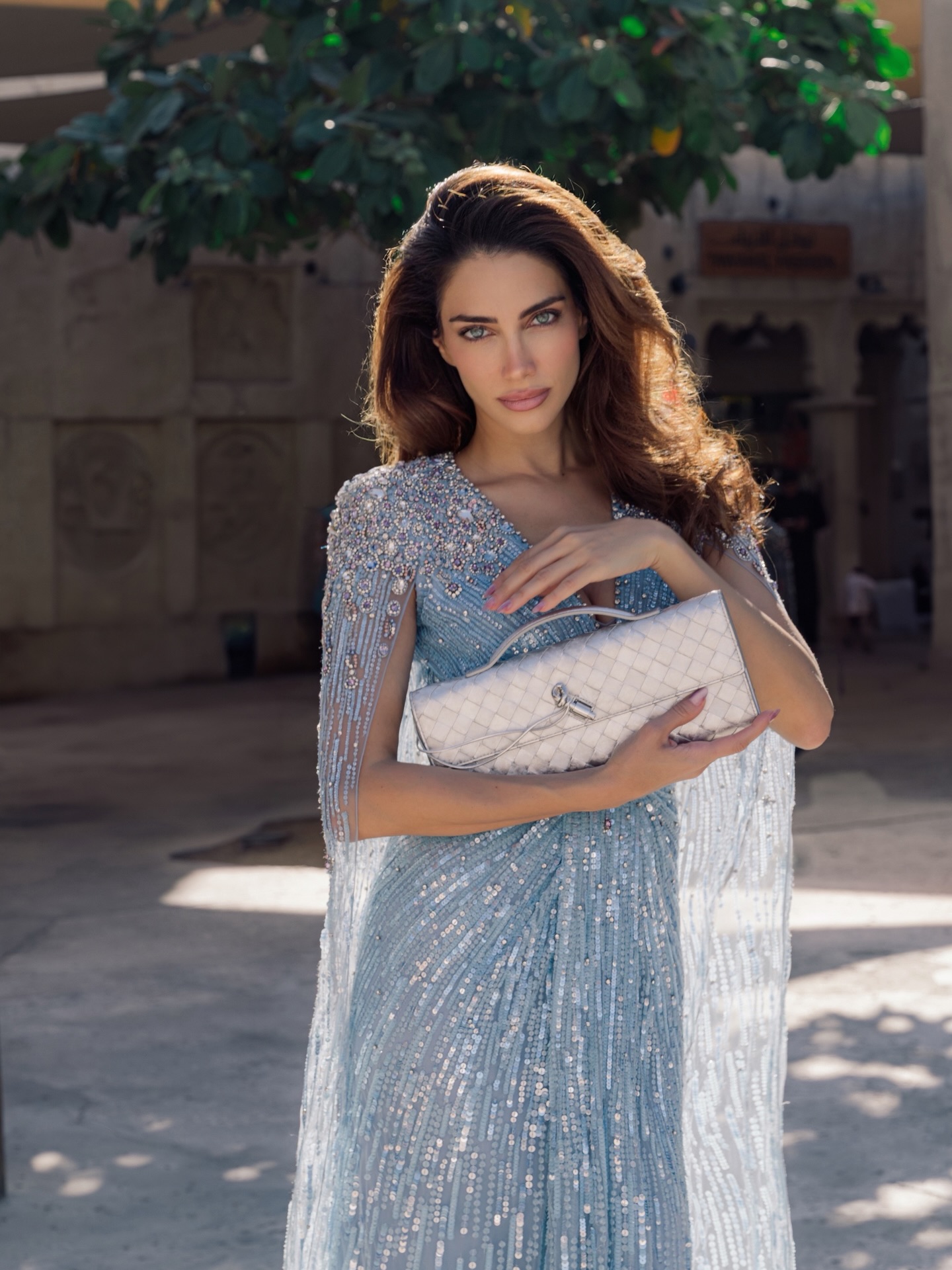 تألّقت جيسيكا قهواتي بفستان طويل بنمط الكاب لون أزرق الباستيل، مطرّز بالكامل بالخرز والترتر، والكريستال (Symphony Embellished Caped Gown) من “جيني باكهام” (Jenny Packham) بقيمة 4,760 يورو، تميّز بتفصيل الزمزمة، مع ياقة عميقة على شكل حرف V باللغة الأجنبيّة، وكاب ينسدل على طول الفستان. ونسّقت جيسيكا إطلالتها الأنيقة بحقيبة من الجلد الفضيّ (Andiamo Intrecciato Metallic Leather Clutch) من “بوتيغا فينيتا” (Bottega Veneta) بقيمة 3,000 يورو، وانتعلت كندرة مدبّبة من المخمل الرمادي الفاتح منمّق بأحجار كريستاليّة (Cosmic Love 105 Embellished Velvet Pumps in Grey) من “أكوازورا” Aquazzura) بقيمة 1,095 يورو.