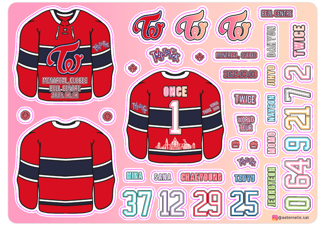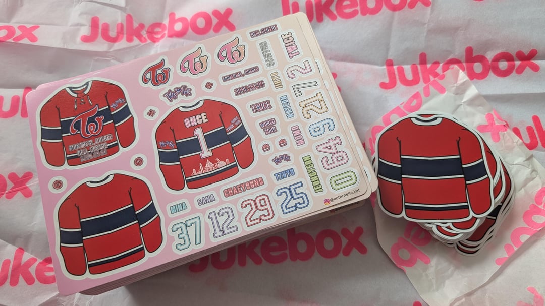 لقد تلقيت الهدايا المجانية التي صممتها وهي تبدو جيدة جدًا. لقد استلهمت بشدة من المكان، وقمت بإعداد ورقة ملصقات تحتوي على 3×2.5" قمصان الهوكي، مع واحدة يمكنك تخصيصها بنفسك. هناك أيضًا 3 منفصلة" ملصق مقطوع على شكل نرد لتحيز آخر (كان هناك عرض ترويجي لـ 50 ملصقًا إضافيًا بالإضافة إلى قسيمة خصم بنسبة 15% على أوراق الملصقات).