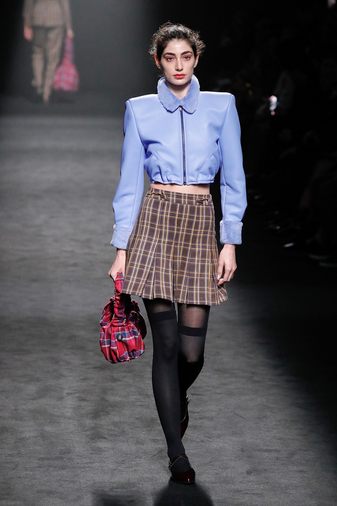 من وحي أفكار تنسيق التنورة الكارو لشتاء 2026، لفتنا هذا اللوك العصري من علامة Suarez، الذي قدّم رؤية شبابية بلمسة أنيقة مستوحاة من إطلالات فتاة المدرسة بأسلوب معاصر. اعتمد اللوك على جاكيت جلد قصير باللون الأزرق السماوي مع ياقة من الفرو، أضفى تبايناً ناعماً ولافتاً مع التنورة الكارو عالية الخصر.