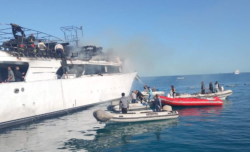 بدون ركاب.. حريق بمركب سياحي يرسو على شاطئ منتجع في جنوب الغردقة