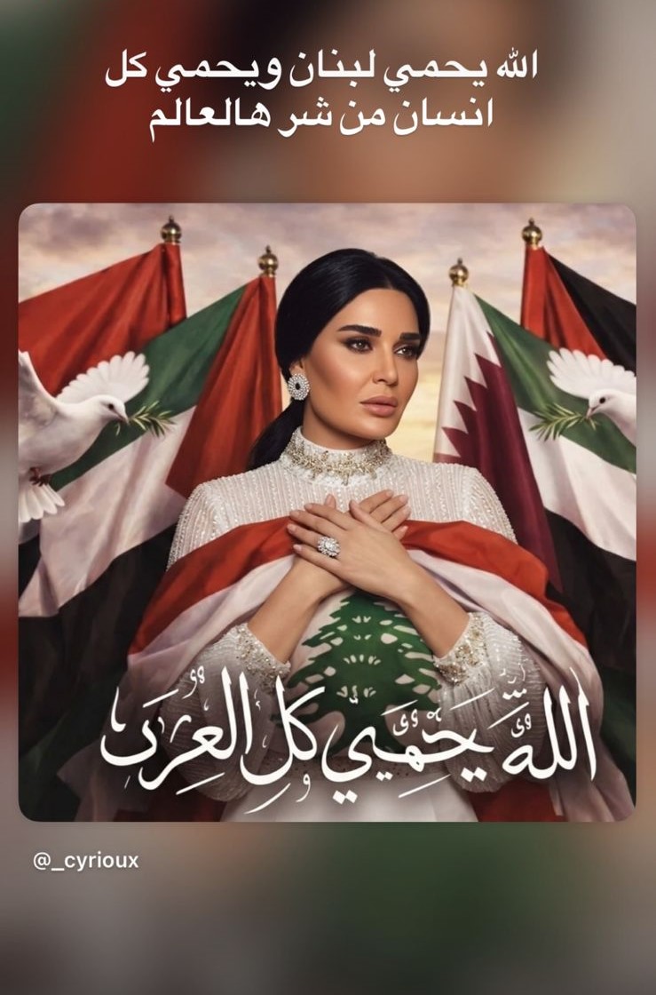 وشوهدت في الصورة المتداولة وهي تحتضن العلم اللبناني، وخلفها أعلام عدد من الدول العربية، فيما كُتبت عبارة: “الله يحمي لبنان ويحمي كل إنسان من شر هالعالم”، إلى جانب عبارة “الله يحمي كل العرب”.