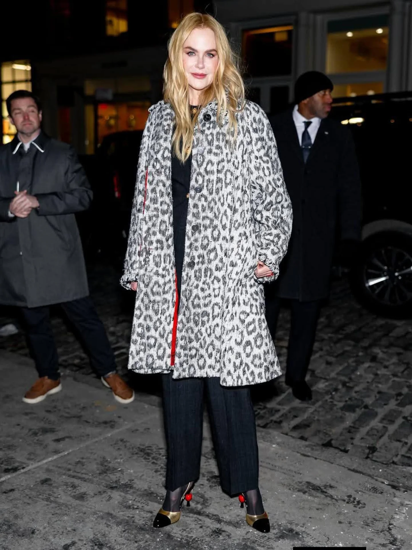 الإطلالة الثالثة التي رصدتها عدسات الباباراتزي لنيكول كيدمان في شوارع نيويورك أثناء ترويجها للمسلسل الجديد، كانت بسروال أسود واسع مع “توب” من اللون نفسه من “شانيل” (Chanel)، نسّقتهما مع معطف معتدل الطول بنقشة جلد الفهد باللونين الأبيض والأسود، وانتعلت كندرة باللونين الأسود والذهبي من مجموعة ما قبل شتاء 2026 من “شانيل” (Chanel)، وحملت حقيبة كتف من الجلد الأسود المبطن من العلامة نفسها.