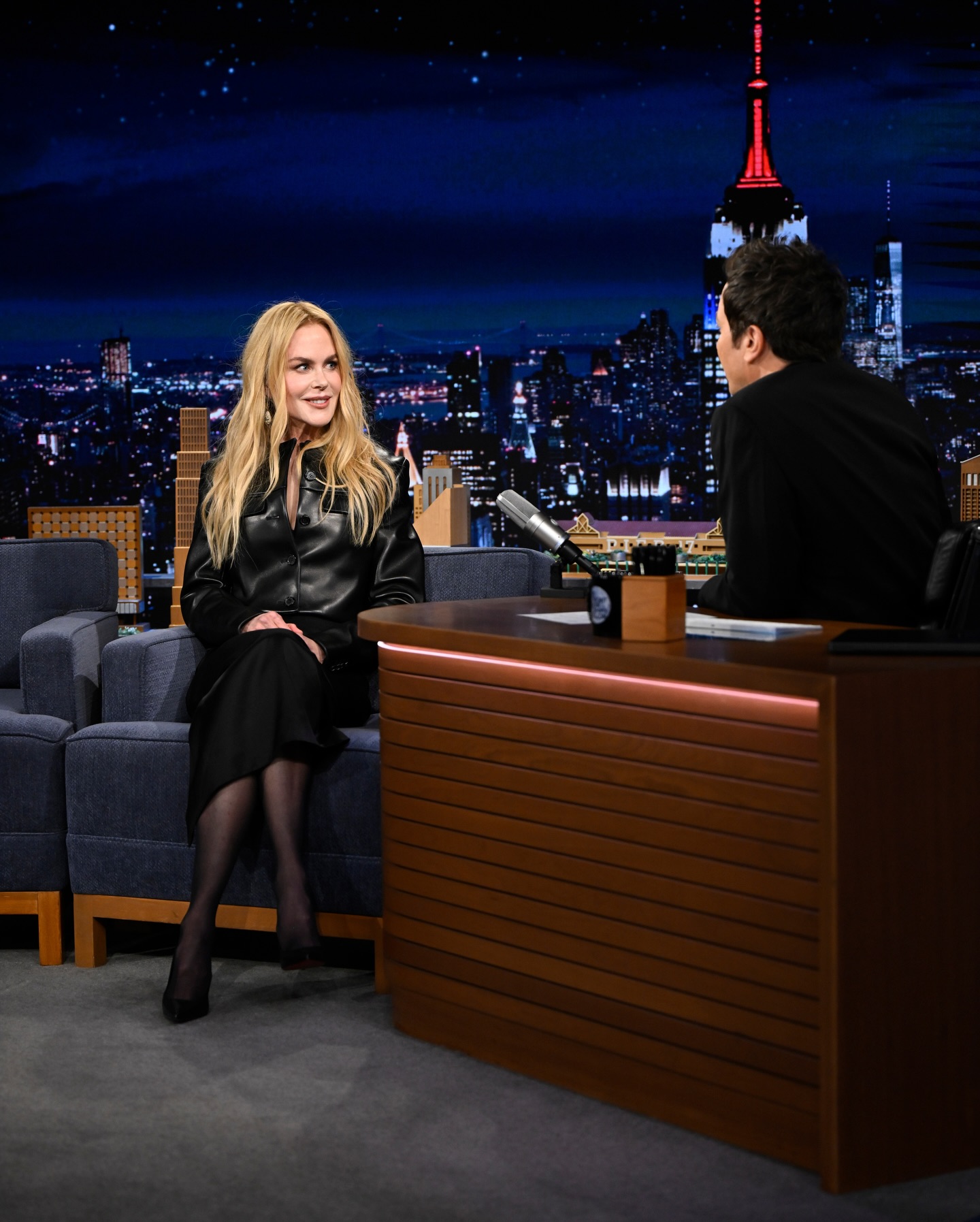 في برنامج (The Tonight Show) الذي يقدّمه جيمي فالون، اختارت نيكول كيدمان إطلالة مونوكروميّة باللون الأسود من علامة “خيط” (Khaite)، شمل تنّورة طويلة ضيّقة وسترة قصيرة من الجلد، وانتعلت كندرة مدبّبة بكعبٍ شاهق من “كريستيان لوبوتان” (Christian Louboutin).