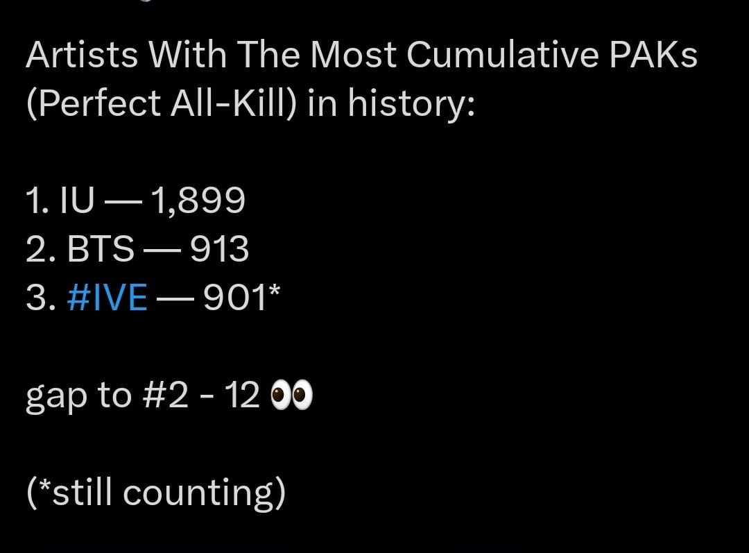 واو، أنا فخور جدًا بـ IVE. التفكير في أن مجموعة غير كبيرة من 4 من Starship ستصبح واحدة من صانعي النجاح على الإطلاق من جيلهم في غضون 5 سنوات. هذا عبارة عن تراكم لنتائج متعددة، وليس نتيجة واحدة (After Like، Love Dive، Kitsch، Bang Bang، إلخ). نأمل أن تظل IVE وفية لمهنتها ويمكنها الاستمرار في تقديم موسيقى مذهلة لنا في المستقبل.
