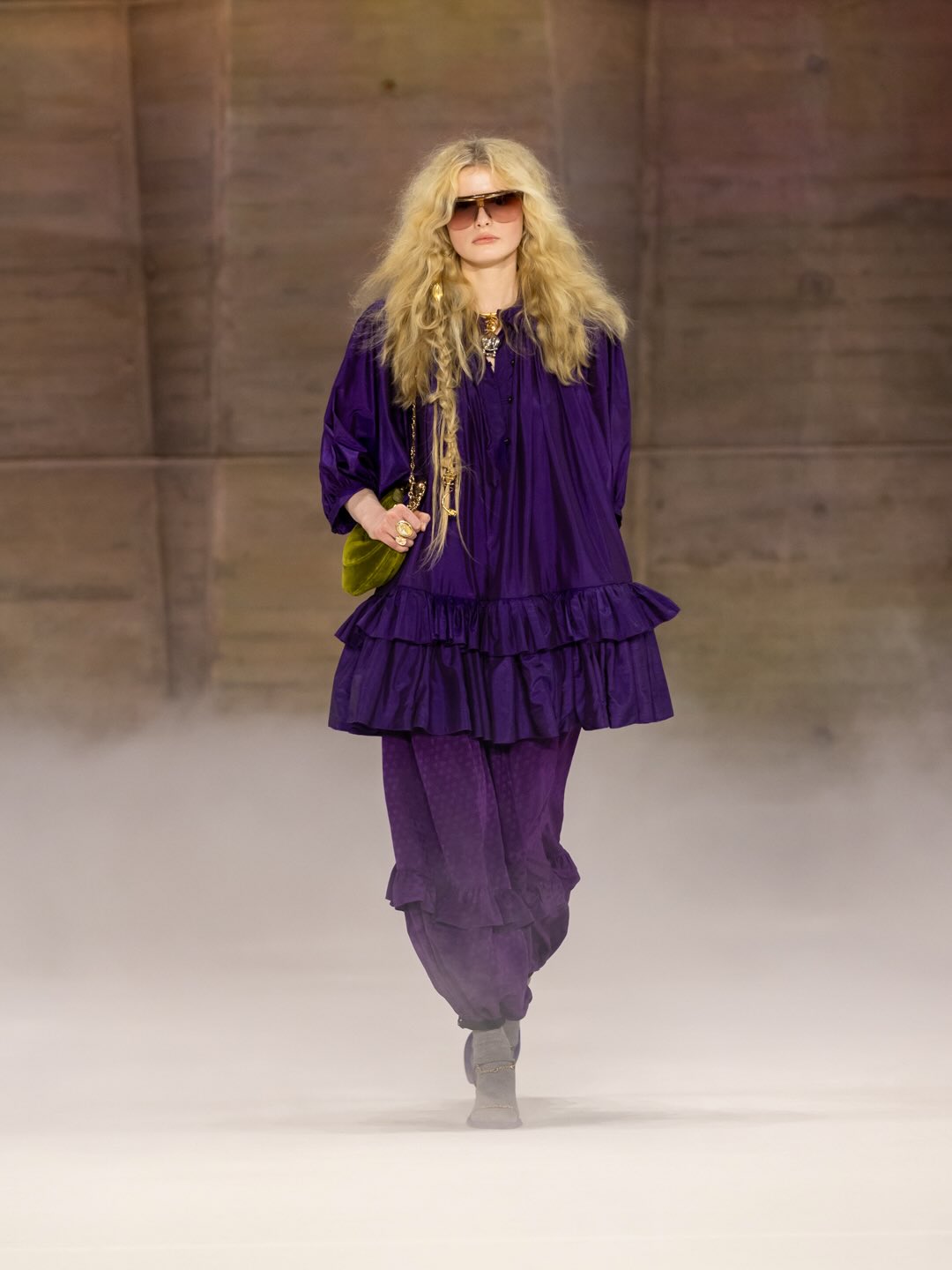 أكملت الإطلالة تصفيفات شعر غير مرتبة، نظارات صغيرة دائرية، وأحذية خشبية تعكس أسلوباً شبه ريفي وحياة جماعية مستوحاة من ثقافة الهيبي. سحبت القطع الحرفية مثل الكارديغانات المطرزة والسترات المرقعة القلوب نحو دفء منزلي ولمسة إنسانية واضحة.