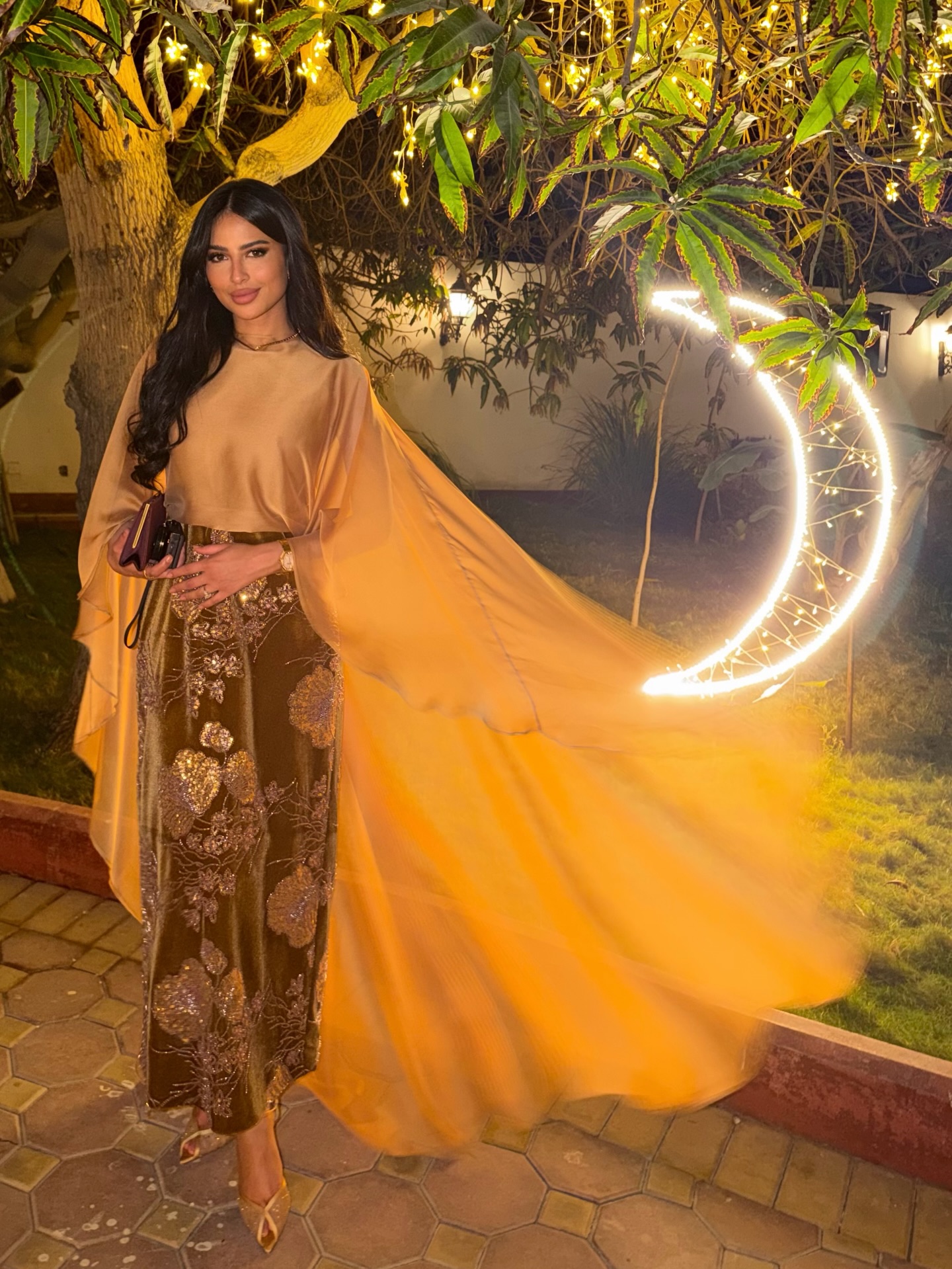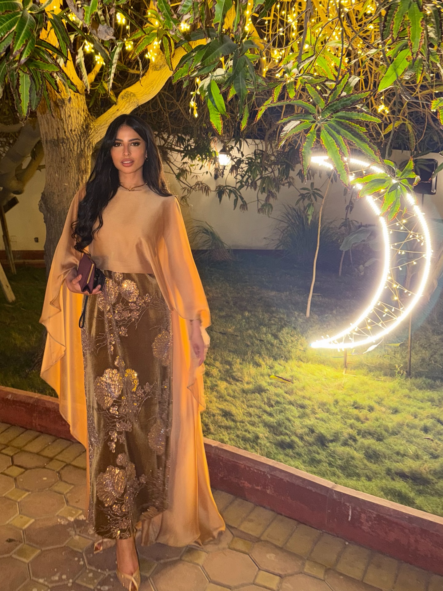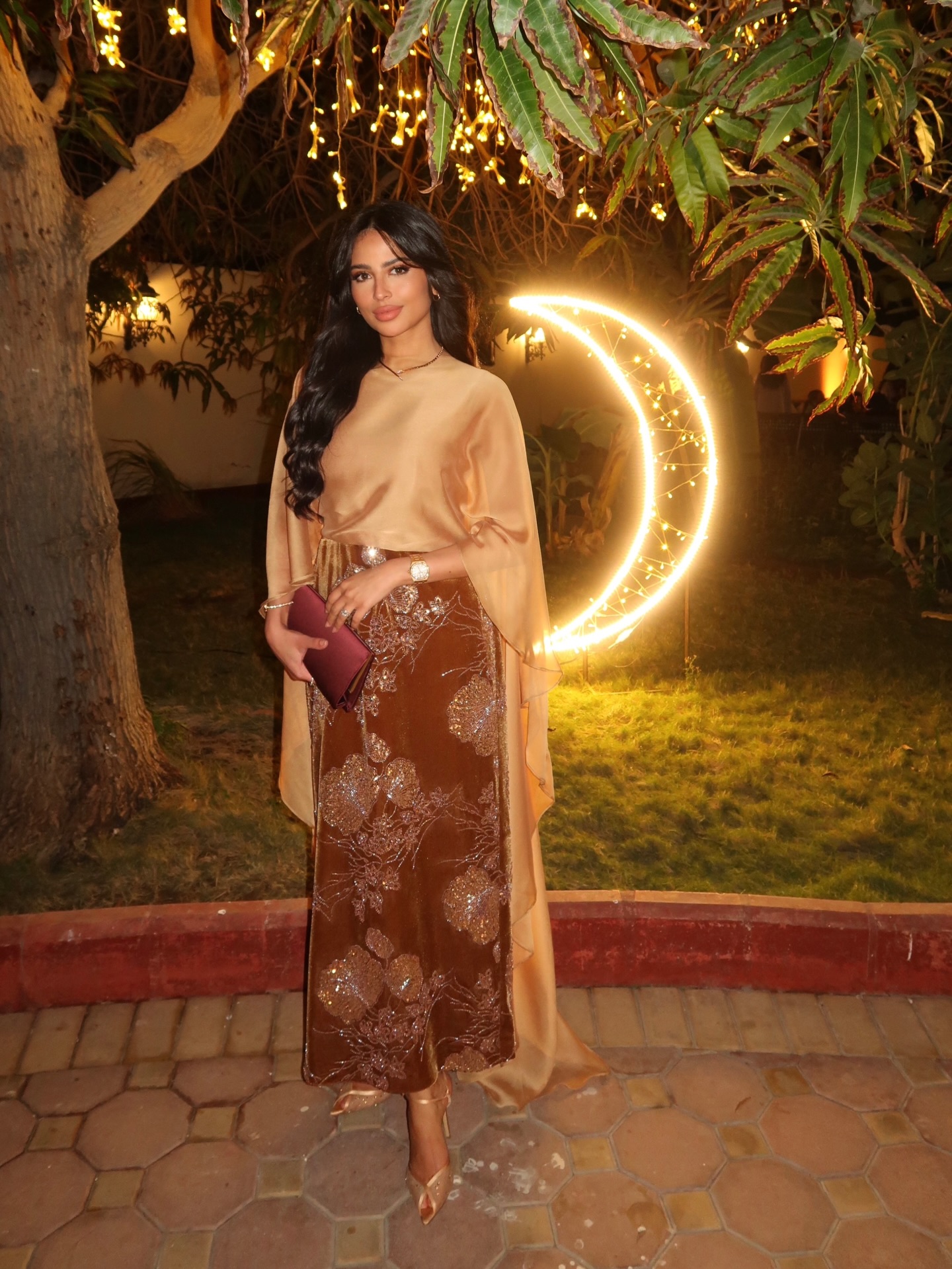 تألّقت لمى العقيل بتصميم أنيق ومميّز من المبدعة السعوديّة نور الظاهري بدا مثالياً في ليلة رمضانيّة، وهو مؤلّف من تنّورة طويلة بقصّة مستقيمة من المخمل الفاخر بلون القرفة والمطرّز بالترتر والخرز الذهبي، و”توب” بأسلوب عباية قصيرة من الأمام وطويلة من الخلف من الحرير بلون البطيخ الأصفر بكُمين طويلين وواسعين. وزيّنت لمى عنقها بعقد من البلاتين المرصّع بالألماس من “بولغري” (BVLGARI). كذلك، انتعلت لمى العقيل كندرة ذهبيّة برّاقة بنمط (Peep- Toe) من تصميم أندريا وازن، وحملت حقيبة كلاتش من الساتان بلون التنّورة.