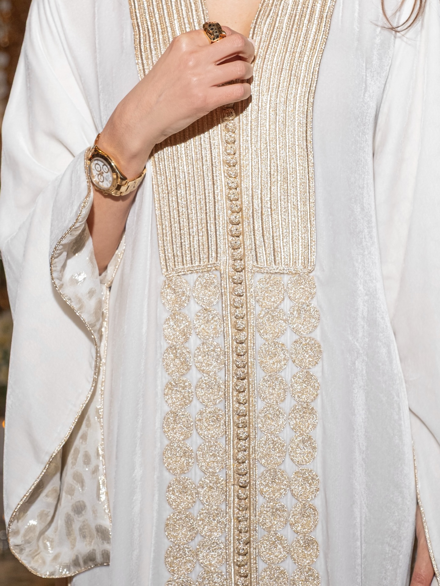 اختارت مريم الأبيض أن تُطلّ بقفطان مغربي أقرب إلى نمط عباية كلاسيكيّة. تميّز التصميم بتطريزات تراثيّة مغربيّة مشغولة بخيوط الذهب الأصفر، و”تليجة” زخرفيّة تزيّن أطراف الكُمّين الواسعين والسروال المكمّل للزيّ، والذي جاء بقصّة واسعة ومطبّعاً بالذهبيّ بنمط جلد الفهد. وأكملت مريم الأبيض إطلالتها بمجوهرات ذهبيّة، من بينها خاتم Panthère من “كارتييه” (Cartier). كذلك، انتعلت مريم صندالاً حياديّ اللون (Rossi Metropolis 70 mm Heeled Sandals) وحملت حقيبة بيضاء بتفصيل ذهبي (Small Diana Bag in Ivory Snakeskin) من “غابرييلا هيرست” (Gabriela Hearst).