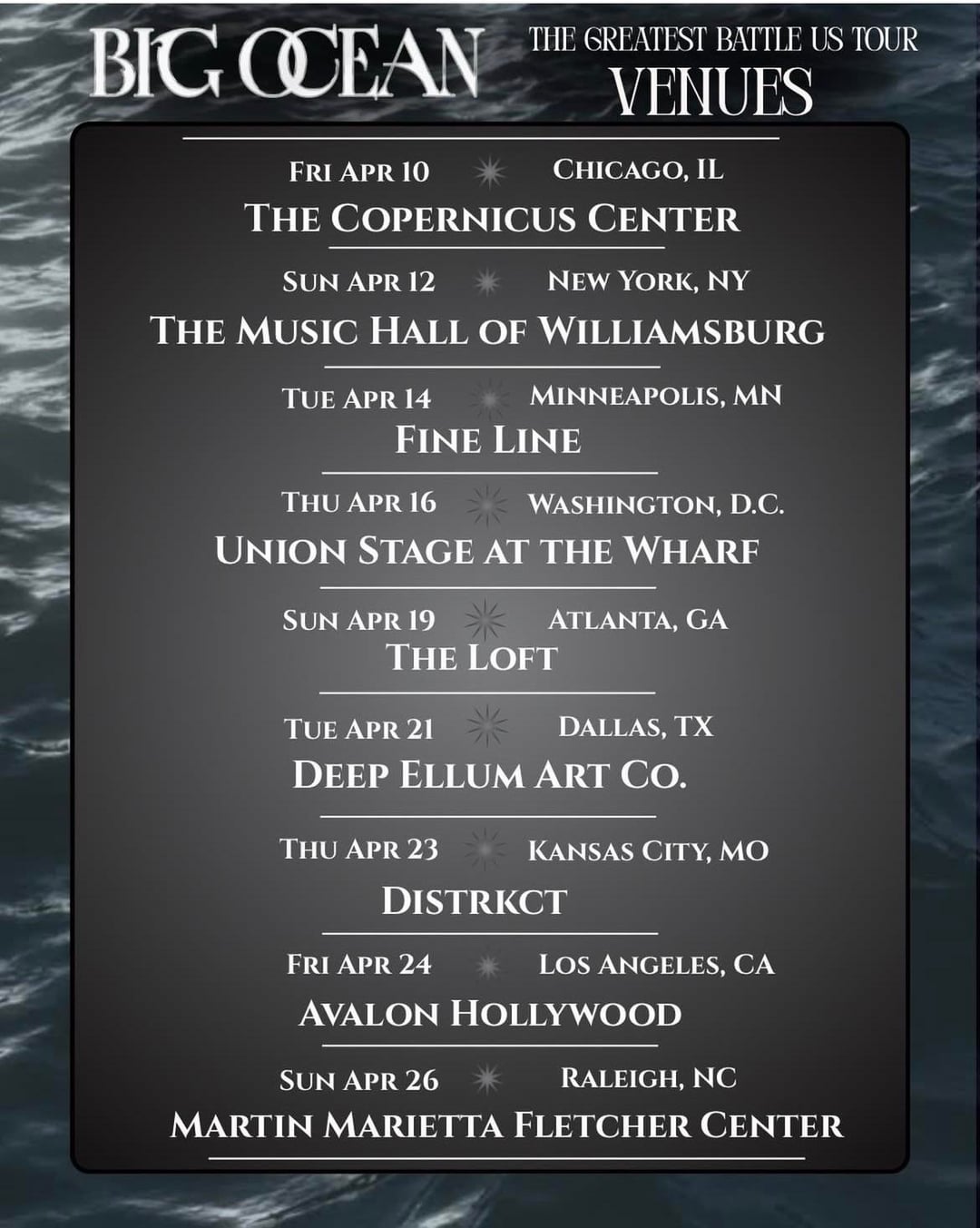 المحيط الكبير - جولة أعظم معركة في الولايات المتحدة، الأماكن، التذاكر ومعلومات الجولة (ملصقات الإعلان)