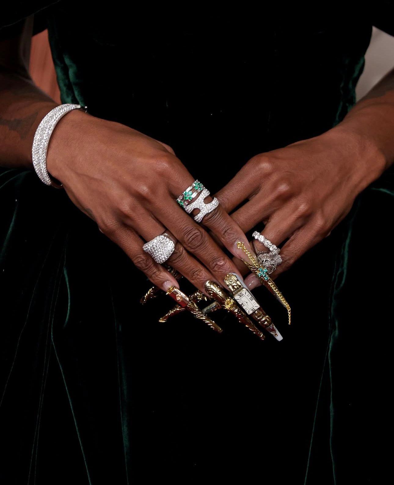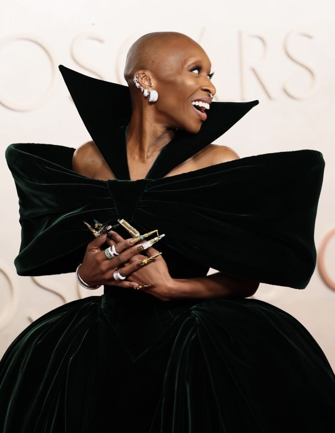 أكملت إيرفو إطلالتها بمجموعة من المجوهرات المرصّعة بالألماس والزمرّد من “روبرتو كوين” (Roberto Coin). ولفتت سينتيا إيريفو الأنظار بمخالبها الطويلة المزيّنة بأكسسوارات فريدة.