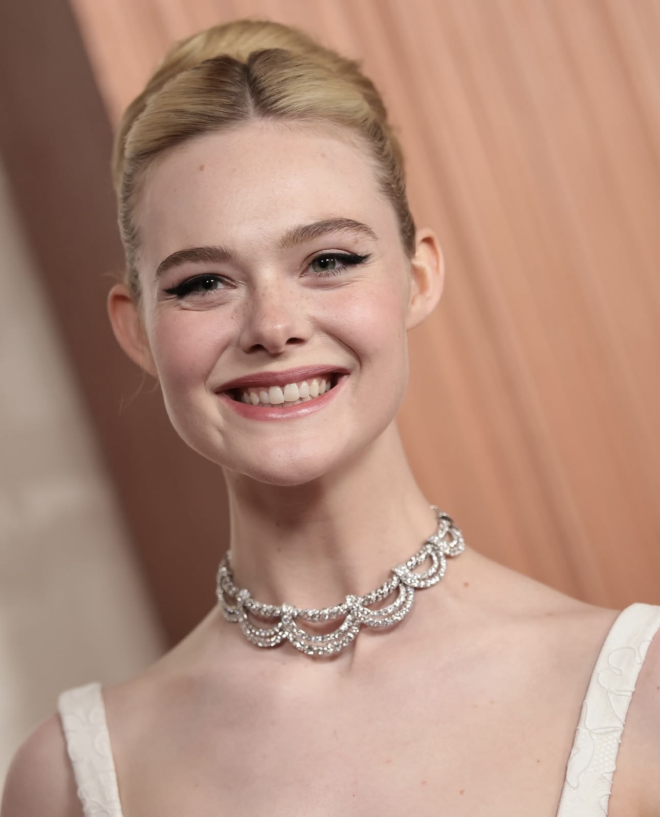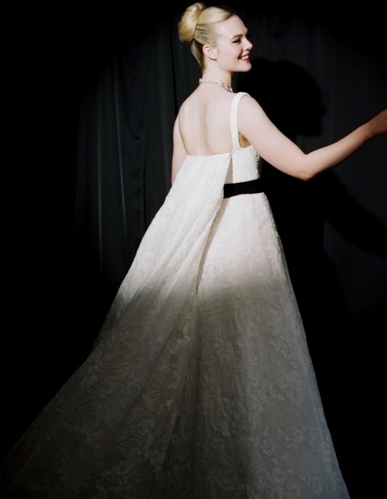 في واحدة من أكثر الإطلالات رومانسية، ظهرت إيل فانينغ بفستان من الغيبور الأبيض من “جيفنشي” Givenchy، عكس روح هوليوود في الزمن الذهبيّ. تميّز الفستان بقصّة طويلة واسعة وخصر منحوت يزيّنه حزام من المخمل الأسود معقود على شكل فيونكة. جاء الفستان بحمّالات عريضة وهو مكشوف الظهر وينسدل منه قطار متوسّط الطول. كذلك، زيّنت إيل فانينغ عنقها بعقد مميّز من “كارتييه” (Cartier)، يعود تصميمه للعام 1958.