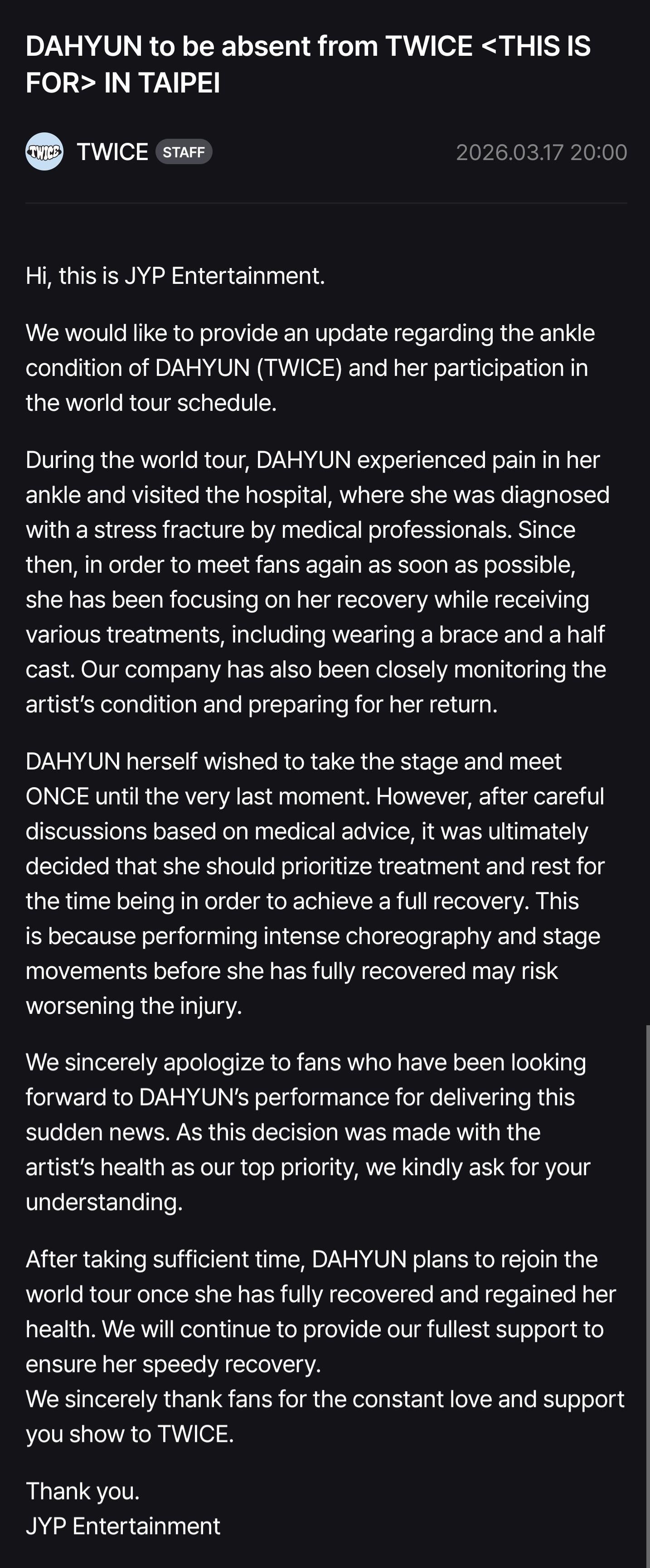 260317 تحديث معجبي توايس – داهيون ستغيب عن توايس <هذا من أجل> في تايبيه