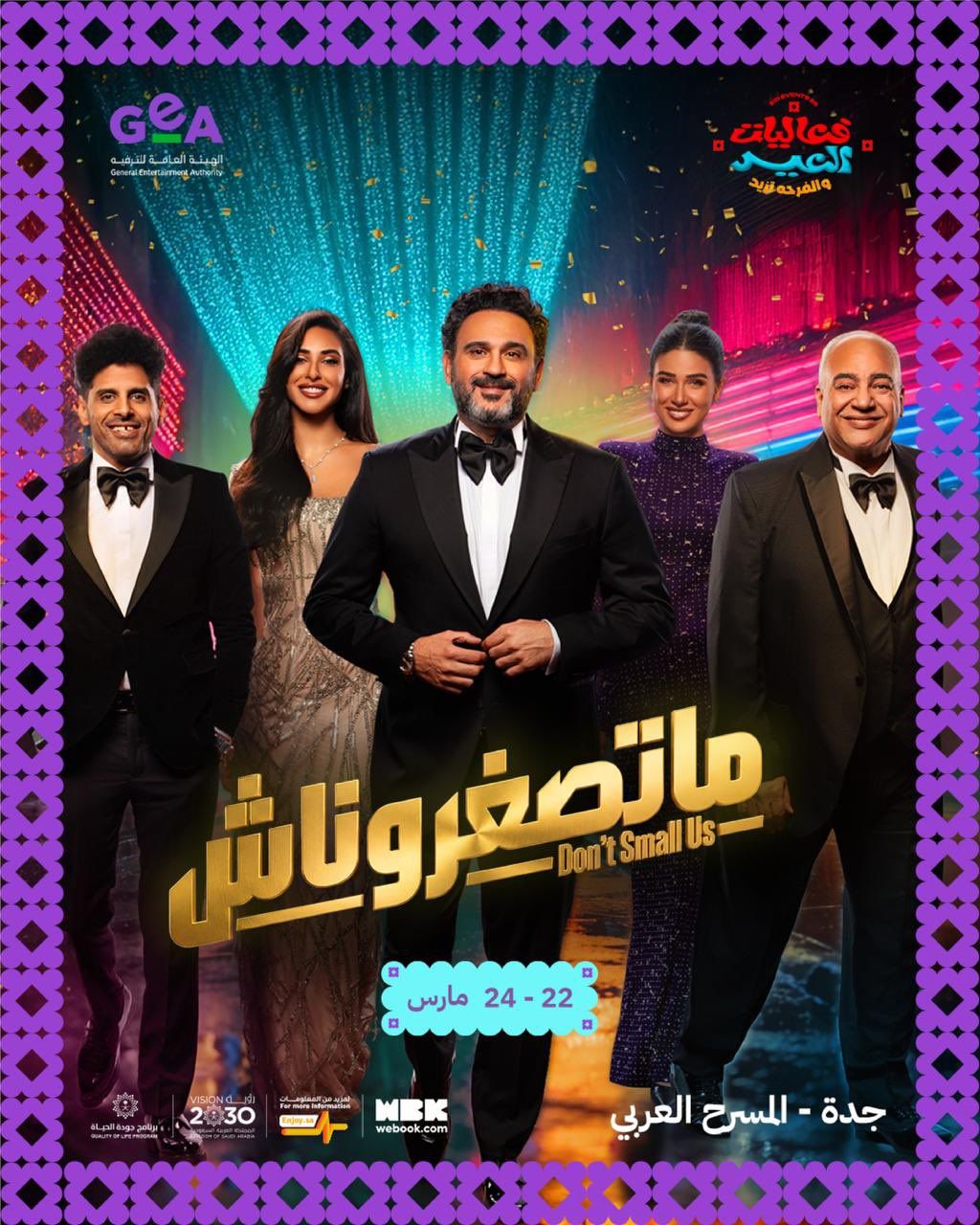 كذلك أعلنت هيئة الترفيه عن مسرحية جديدة بمناسبة العيد وقالت: “لا تفوتوا مسرحية “ما تصغروناش” مع الفنان أكرم حسني ومجموعة من النجوم، على المسرح العربي في جدة، ضمن فعاليات العيد، في الفترة من الثاني والعشرين وحتى الرابع والعشرين من مارس – احجزوا تذاكركم الآن”.