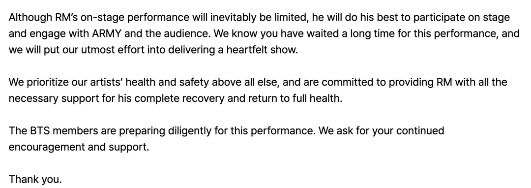 سوف يغيب BTS RM عن أداء BTS المباشر لعودة “ARIRANG” بسبب إصابة في الكاحل