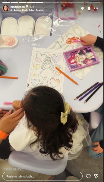 كما نشرت رحمة صورة لابنتها «عالية» وهي تمسك بالألوان وترسم على الطاولة، على أنغام أغنيتها «سبع سعادات»، في لقطة عكست براءة الطفولة وأجواء السعادة التي سيطرت على اليوم.