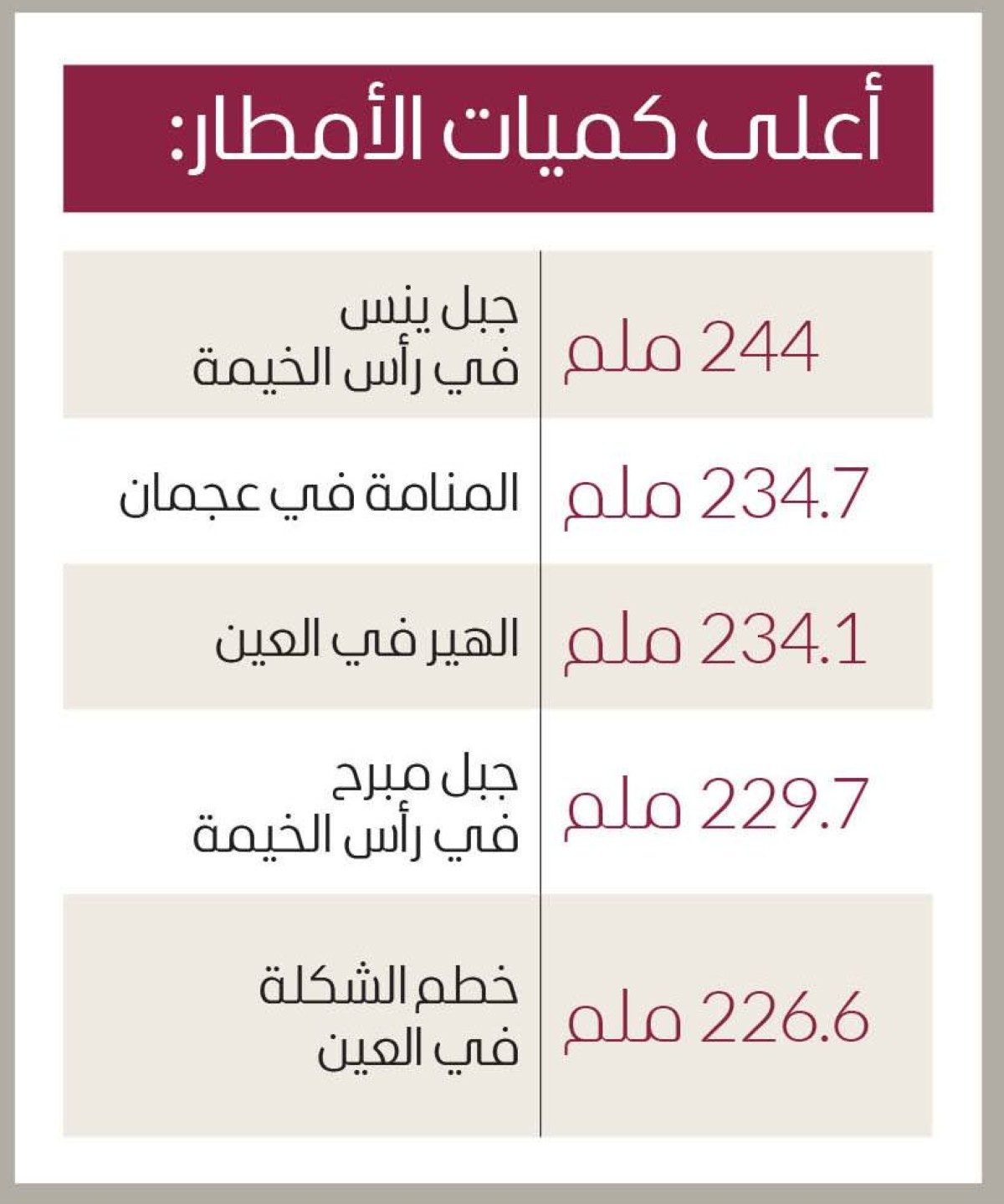 وذكر المركز الوطني للأرصاد، أن جبل ينس في رأس الخيمة تصدر قائمة أعلى كميات الأمطار المسجلة بواقع 244 ملم، تلاه المنامة في عجمان بـ234.7 ملم، ثم الهير في العين بـ234.1 ملم، كما سجل جبل مبرح في رأس الخيمة 229.7 ملم، فيما بلغت كمية الأمطار في خطم الشكلة في العين 226.6 ملم.