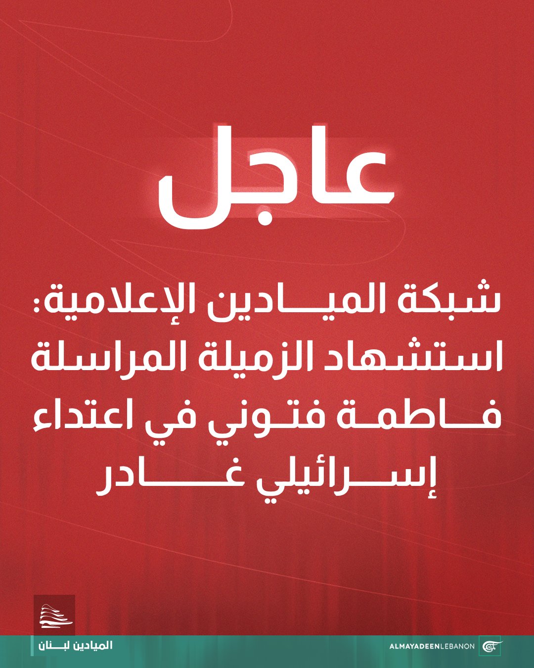 في اعتداء إسرائيلي جديد على الطاقم الإعلامي في لبنان، أدّت غارة إسرائيلية إلى استشهاد الزميلين في قناتي المنار والميادين فاطمة فتوني وعلي شعيب، على طريق عام جزين – كفرحونة.