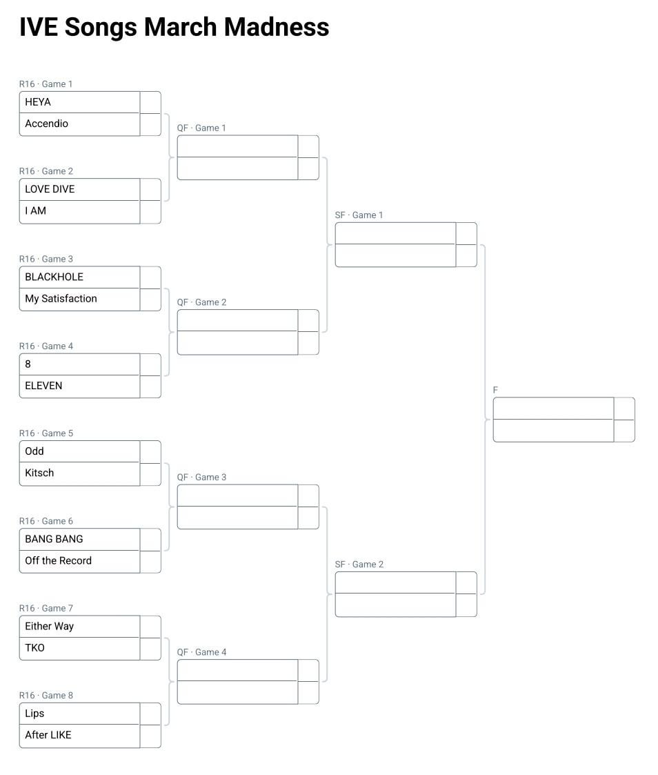 الأقواس المحدثة موجودة في الصورة – سيتم نشر أول مباريات Sweet Sixteen في وقت لاحق اليوم! بحلول الأسبوع المقبل، سنعرف ما هي أفضل أغنية لـ IVE!