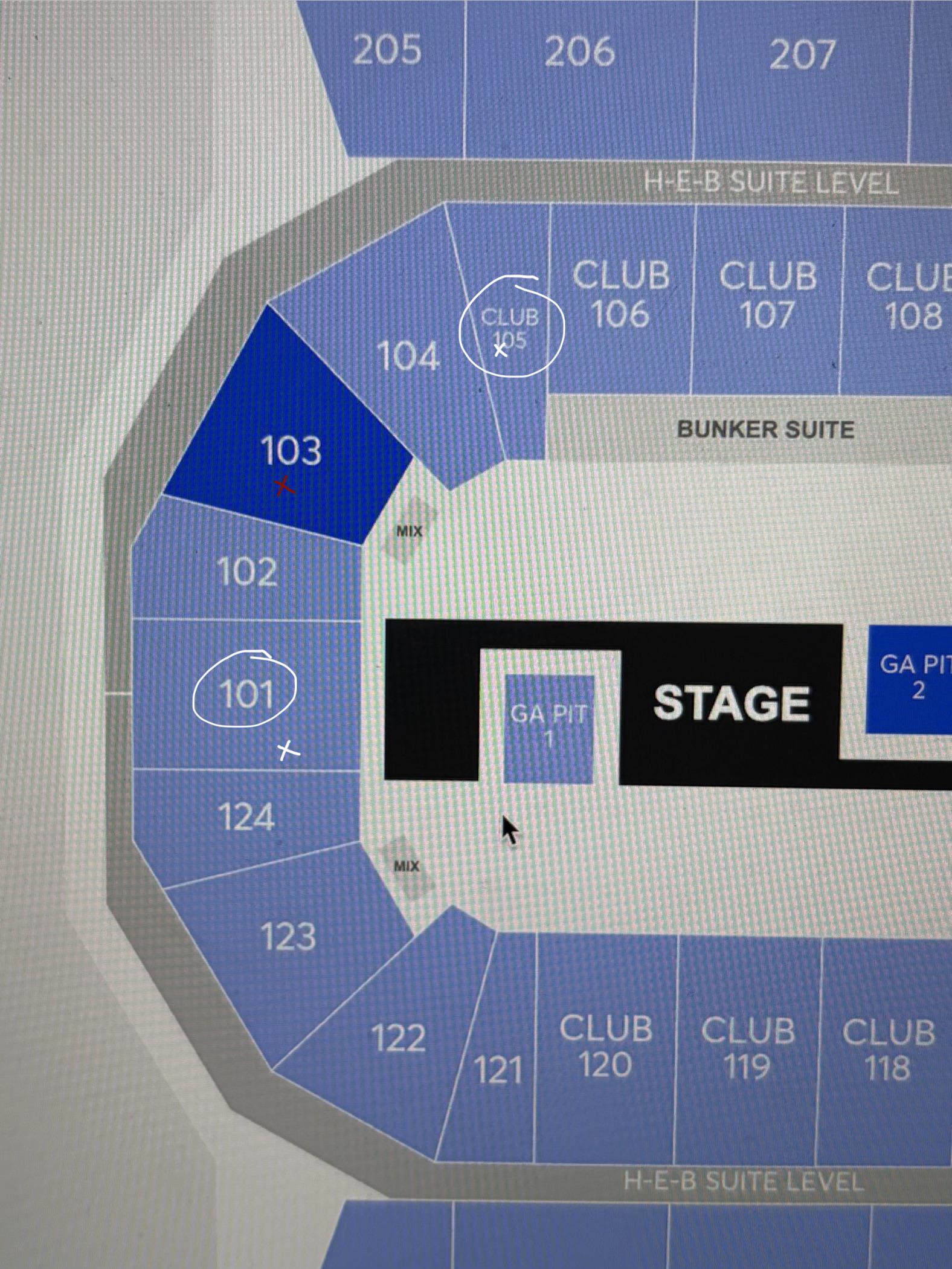 أهلاً! حصلت على تذكرتين في القسم 103 (الموضحين بعلامة x الحمراء) لتذكرتين، تبلغ قيمة كل منهما 274.21 دولارًا. بعد البحث في Ticketmaster، هناك قسمان يمكنني استبدالهما، ولكني بحاجة إلى مساعدة في تحديد ما إذا كان الأمر يستحق ذلك أم لا. يقع القسم 101 أمام الجانب مباشرةً، بينما يقع القسم 105 في الزاوية قليلاً، ولكنه يواجه الجانب الطويل من المسرح. سيكون موضع تقدير أي نصيحة!