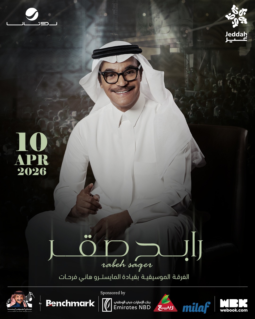 أعلنت “مجموعة روتانا للموسيقى”، التي اعتادت ان تقدم كل ما هو مميز في مجالي صناعة الموسيقى والترفيه ، عن حضورها القوي ضمن فعاليات “موسم جدة” تحت شعار “جدة غير” بحفل ضخم سيحلق فيه “صقر الغناء” النجم الكبير رابح صقر بصوته وموسيقاه واغانيه الشهيرة على مسرح “عبادي الجوهر أرينا” لجمهور “موسم جدة” تاريخ ١٠  أبريل ٢٠٢٦ ويأتي هذا بعد نجاحات عدة قدمها “بوصقر” مع روتانا في “موسم الرياض” وما تلاها من حفلات العيد وحضور مدهش في عدة دول قدّم فيها حفلاته ، وسيقود فرقته الموسيقية الكبيرة المايسترو هاني فرحات.
