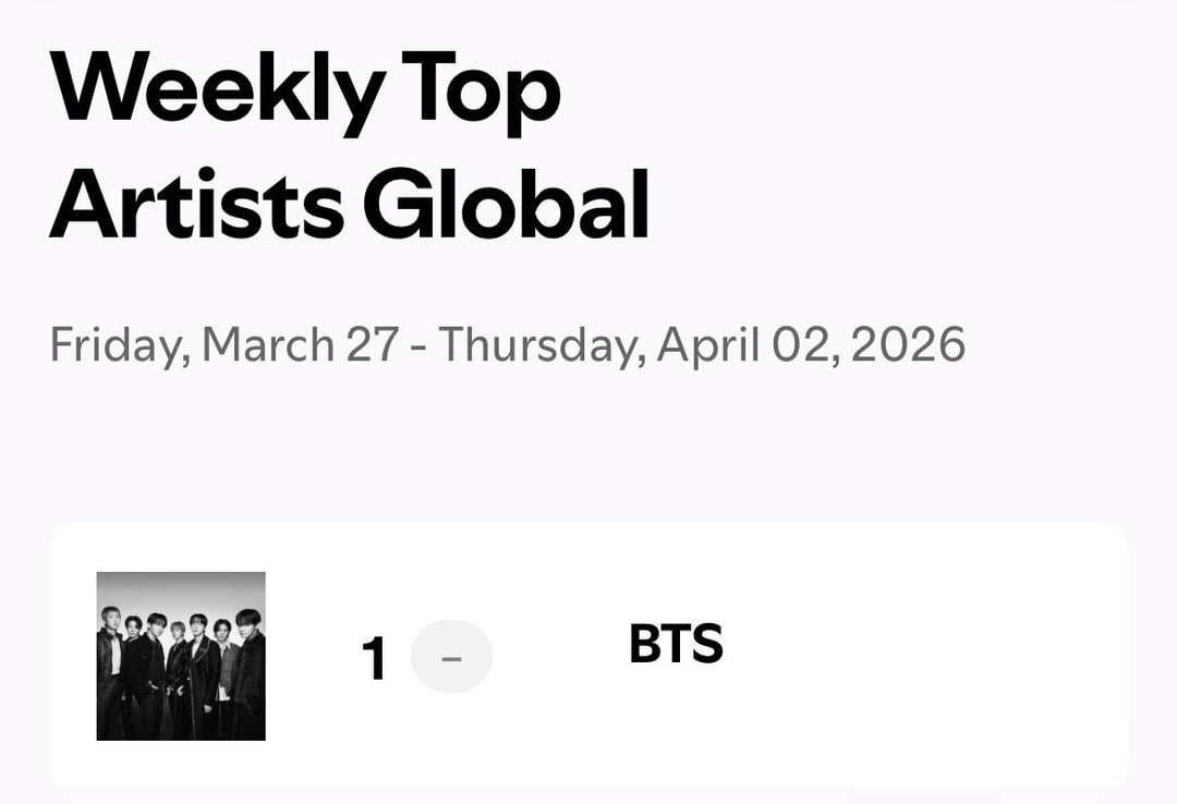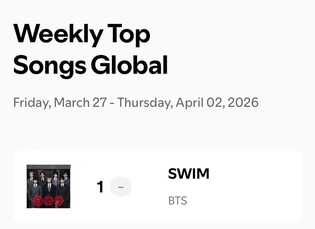 تظل أغنيتا “ARIRANG” و”SWIM” لفرقة BTS في المركز الأول في قائمة أفضل الألبومات الأسبوعية العالمية وأفضل الأغاني الأسبوعية على موقع Spotify، بينما تظل فرقة BTS في المرتبة الأولى في قائمة Spotify Weekly Top Artists Global Chart.