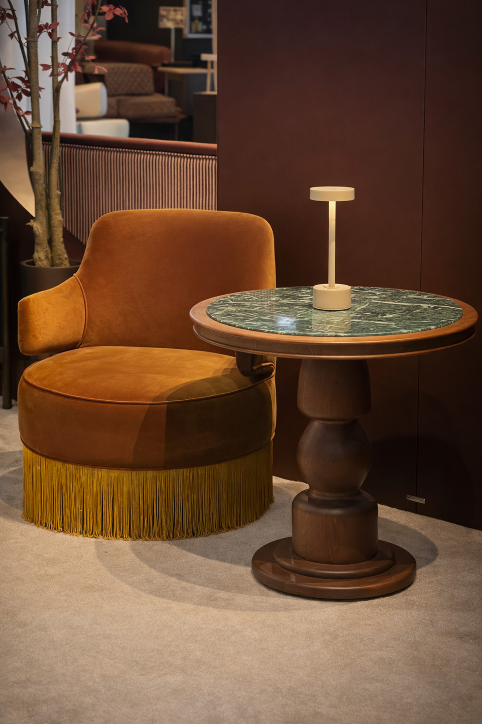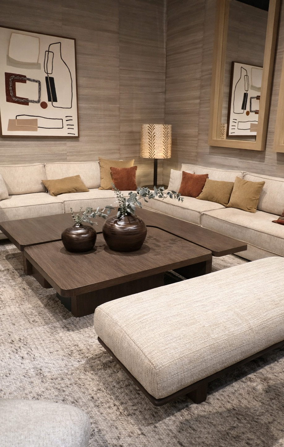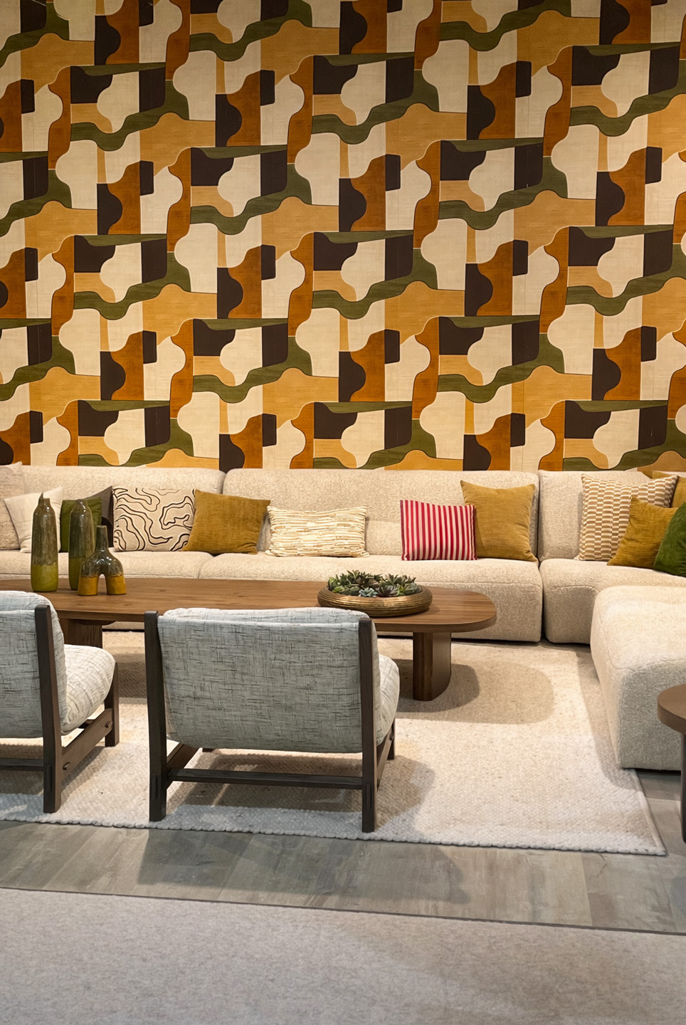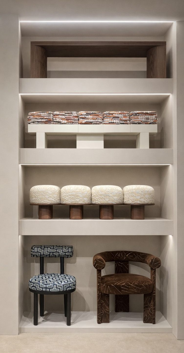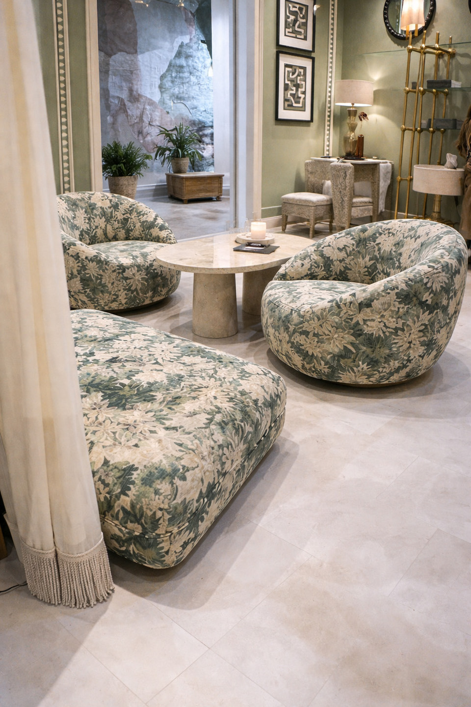 برزت قطعُ الجلوسِ المغطاةُ بالكاملِ بأقمشةٍ مطبوعةٍ، إذ لم يعد الأثاثُ مجرَّد عنصرٍ وظيفي، بل تحوَّلَ إلى قطعةٍ نحتيَّةٍ قائمةٍ بذاتها، تمتلك هويَّةً بصريَّةً فريدةً في النقشِ والملمس.
