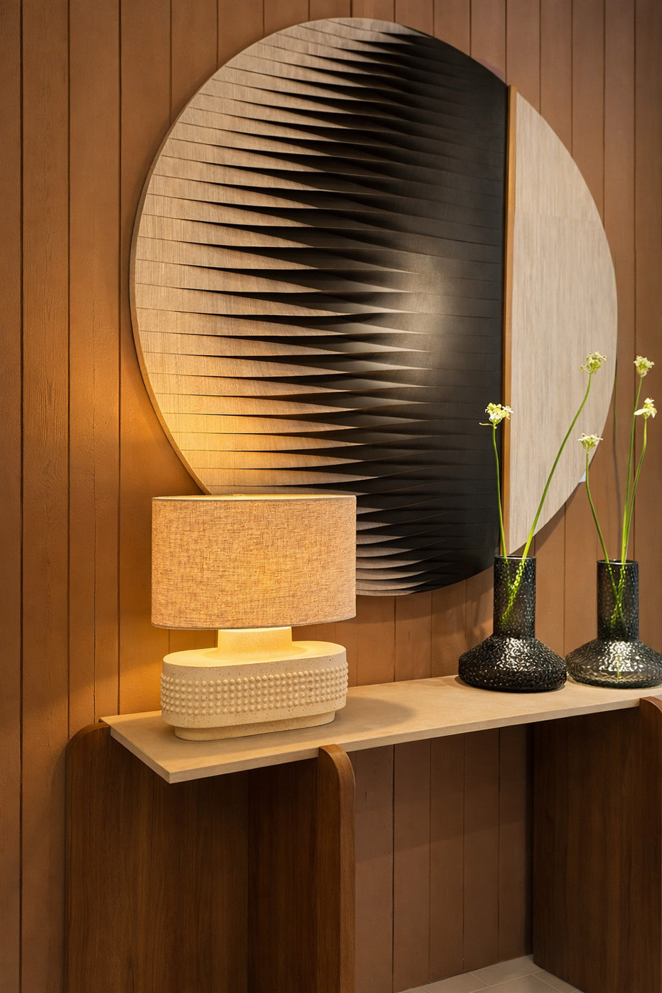 تعتمدُ الألوانُ الدافئةُ على تشطيباتِ الخشبِ الطبيعي الفاتح مع استخدامِ خاماتٍ شبيهةٍ بالراتان في الإضاءةِ والأثاث. وتُضفي درجاتُ الخردلي، والأخضرِ المريمي، والأحمرِ المعتم حيويَّةً وعمقاً، ما يخلقُ مساحاتٍ دافئةً، ومريحةً، ومرتبطةً بالطبيعة.