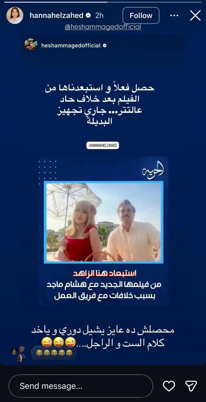 بدأت القصة عندما نشر هشام ماجد تعليقًا فكاهيًا عبر خاصية “ستوري” على إنستغرام، تفاعل فيه مع الشائعة المتداولة، قائلًا إنه تم بالفعل استبعاد هنا الزاهد من الفيلم بسبب خلاف على ترتيب الأسماء في التتر، مع الإشارة إلى البحث عن بديلة لها، في إطار ساخر.