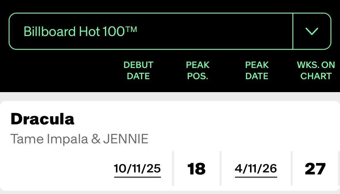 أغنية "Dracula" لـ Tame Impala وBLACKPINK JENNIE تصل إلى ذروة جديدة بالمركز 18 في قائمة Billboard Hot 100
