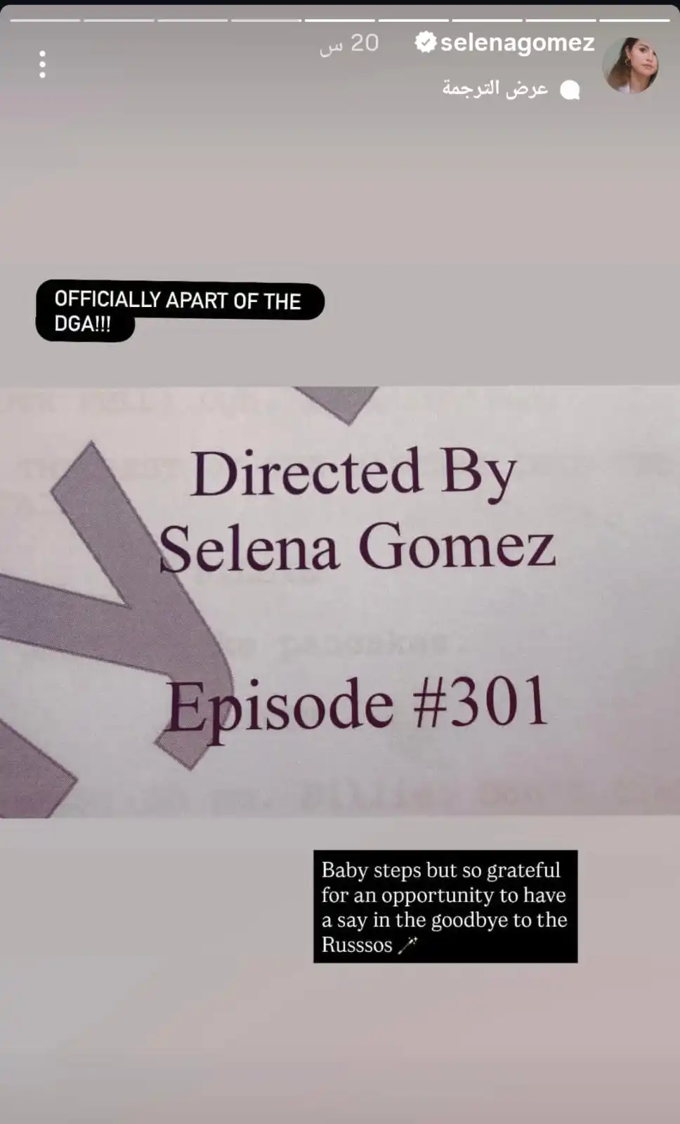 أكدت سيلينا غوميز دخولها عالم الإخراج بشكل رسمي عبر إعلانها الانضمام إلى نقابة المخرجين الأميركية (Directors Guild of America). وشاركت غوميز متابعيها عبر “إنستغرام” صورة لسيناريو الحلقة الأولى من الموسم الثالث، والذي يتصدره اسمها كمخرجة للحلقة، معربة عن امتنانها العميق لهذه الفرصة التي تتيح لها المساهمة في وداع عائلة “روسو” برؤية إخراجية خاصة، في مرحلة تجمع فيها بين مهاراتها كمنتجة ومنفذة وفنانة شاملة.