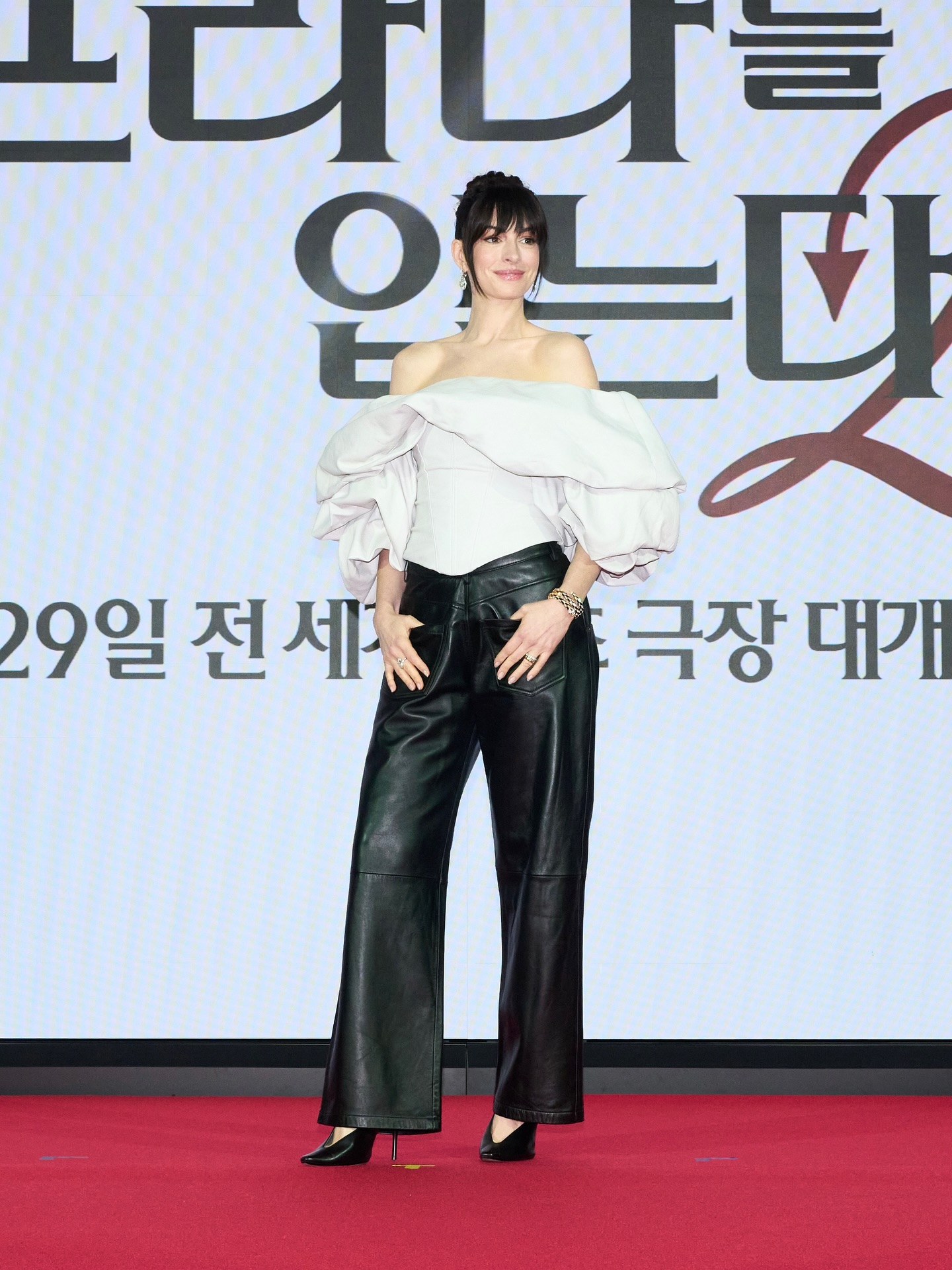 على السجّادة الحمراء، لفتت آن هاثاواي الأنظار بأكثر من إطلالة مميّزة، وأحدثها تلك التي أطلّت بها في العرض الافتتاحي لفيلم (The Devil Wears Prada 2) في سيول، حيث ارتدت تنّورة ضيّقة وسترة عصريّة كلتاهما من الجلد الأحمر من مجموعة خريف وشتاء 2026/2027 من “بالنسياغا” (Balenciaga)، نسّقتهما مع كندرة سوداء (Duchesse Leather Pumps) من العلامة نفسها، ومجوهرات من “بولغري” (BVLGARI).