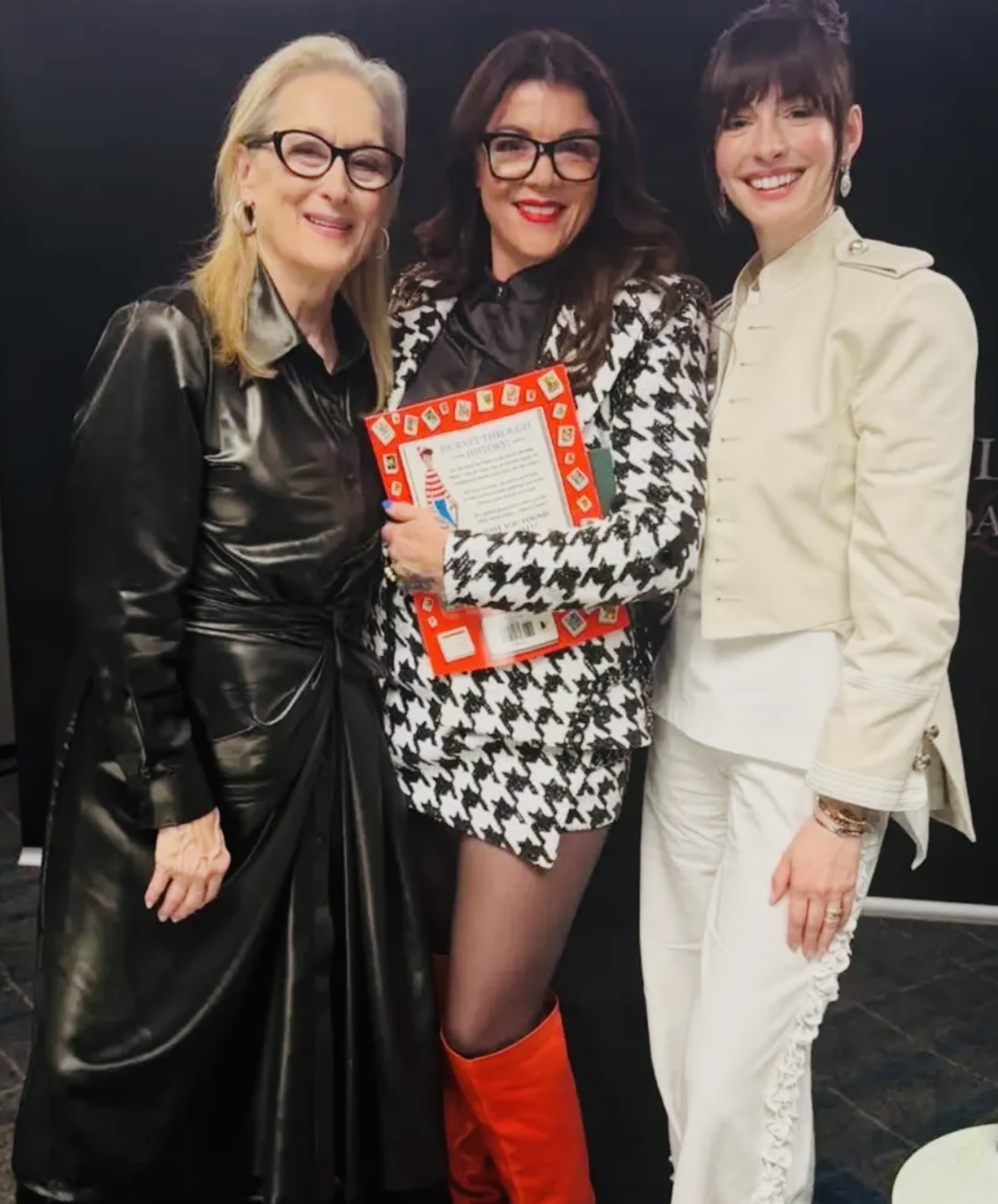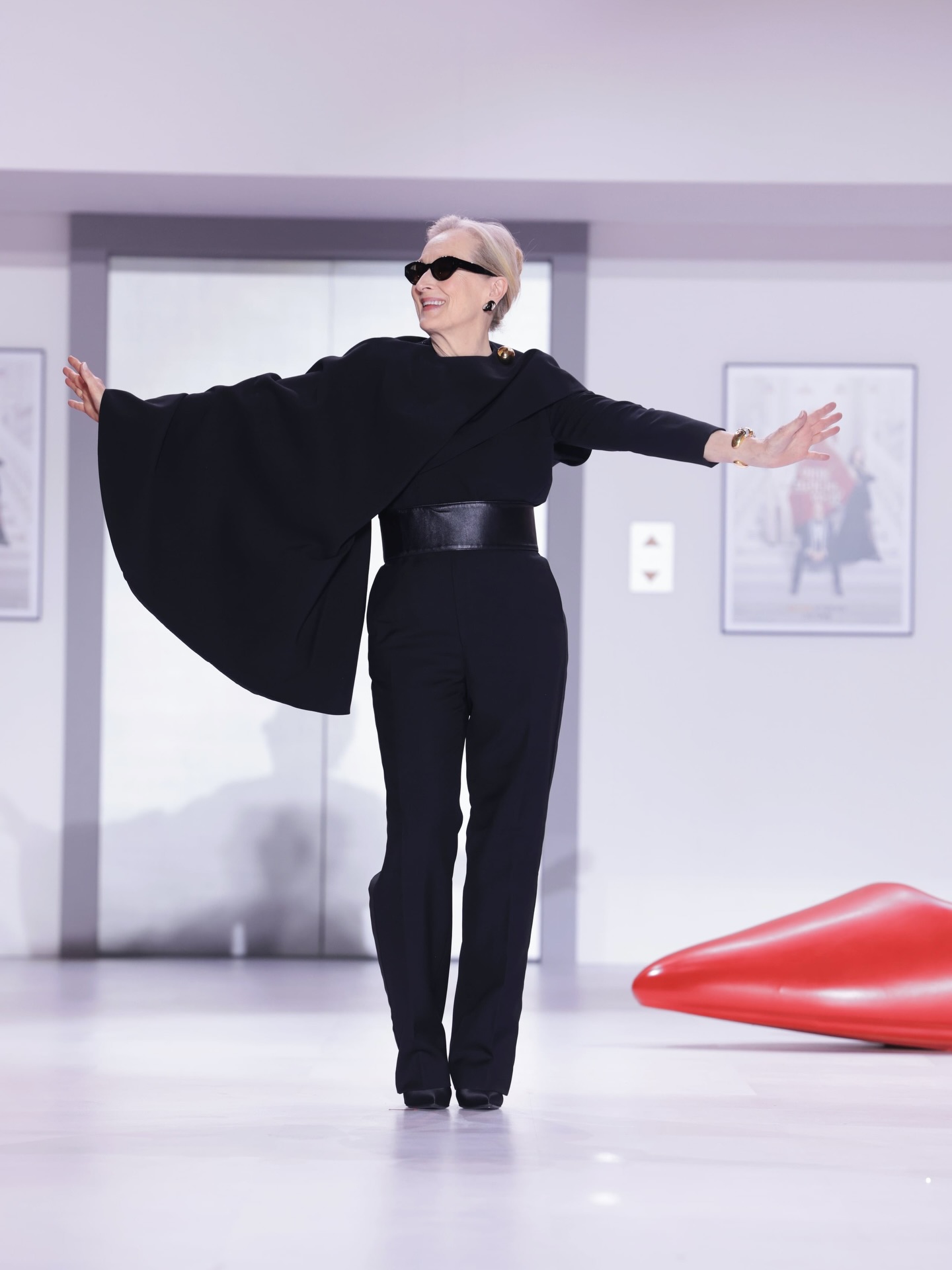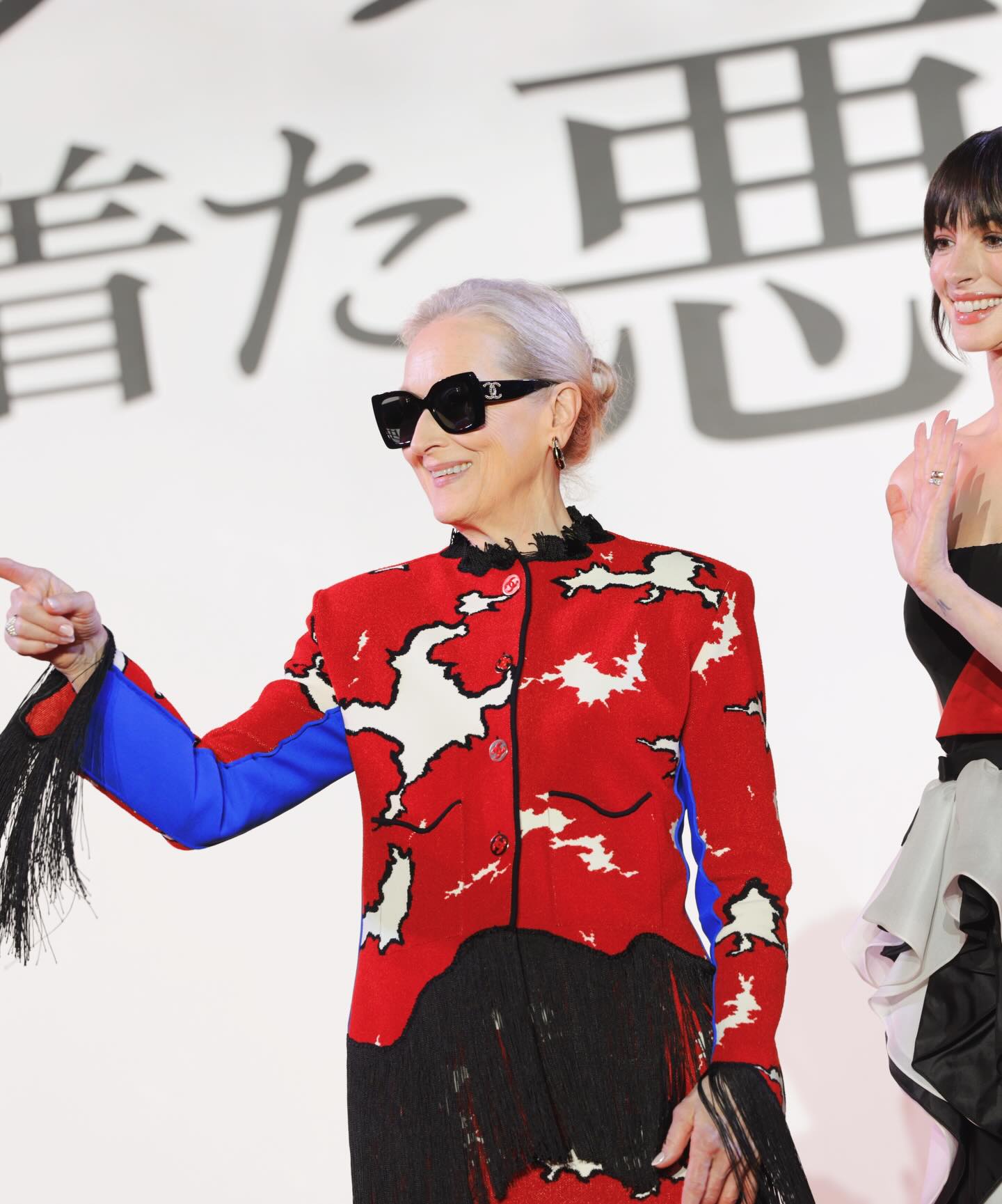 وفي المؤتمر الصحفيّ في طوكيو، تأنّقت ميريل ستريب ببدلة عصريّة سوداء من “سكياباريلي” (Schiaparelli) محدّدة الخصر بحزامٍ ذي إبزيم معدنيّ ذهبي يحاكي لون أزرار السّترة.