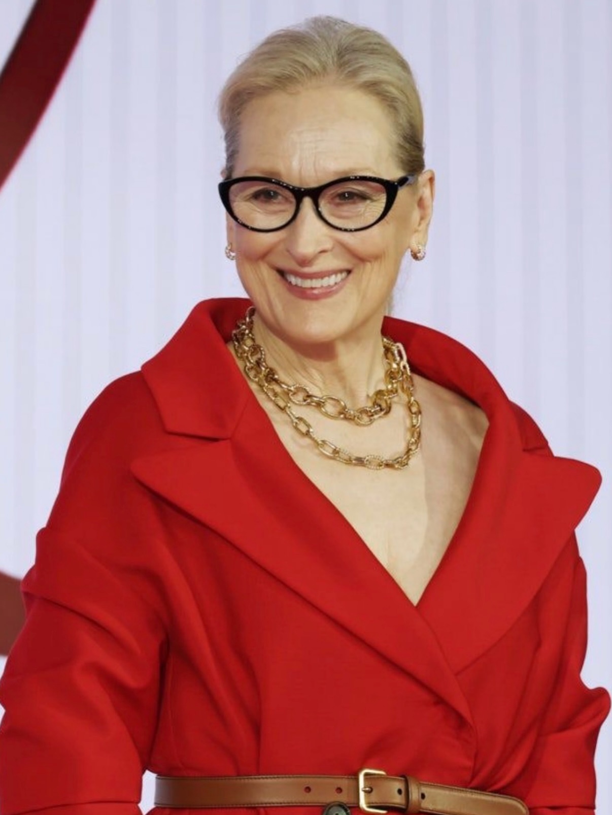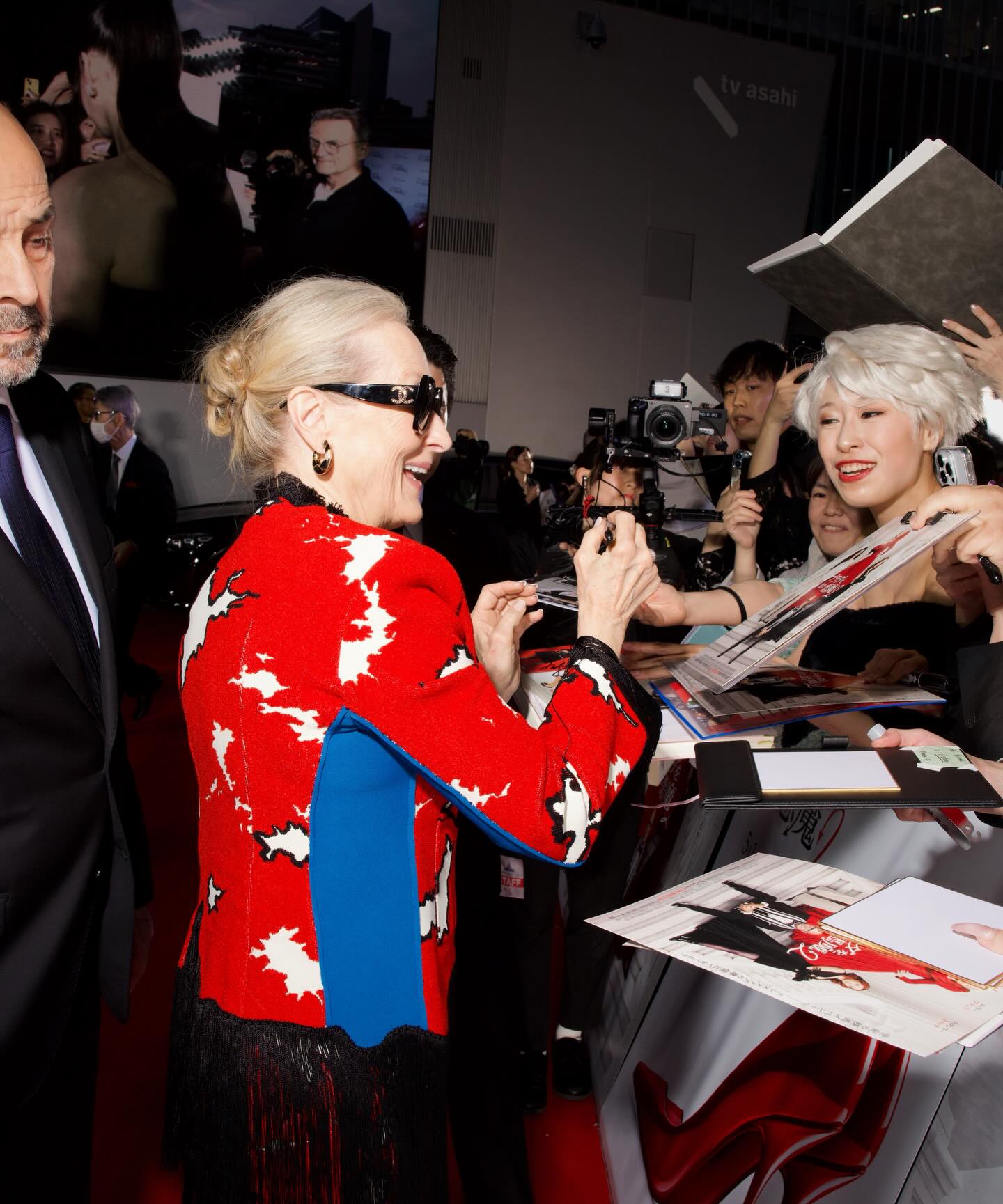 على السجّادة الحمراء في طوكيو، لفتت ميريل ستريب الأنظار بتصميم عصري من “شانيل” (Chanel) مؤلّف من تنّورة وسترة باللون الأحمر المطبّع برسومات باللون الأبيض وتخريجات بلون الأزرق النيلي من الجانبين، أكملته مع كندرة بلوني الأسود والأبيض من العلامة نفسها.