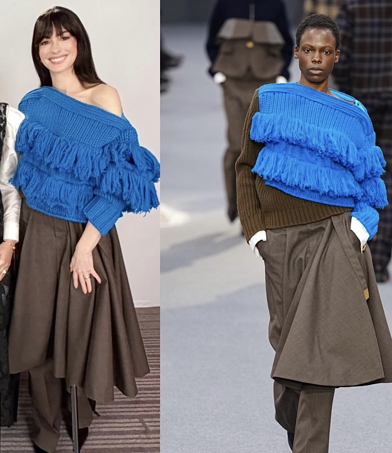 وفي الإطلالة الثانية، ارتدت سروالاً مع تفصيل على شكل تنّورة بنّية باللون مع كنزة محبوكة بلونيّ الأزرق النيلي والبني، مكشوفة الكتف وبتفصيل الشراشيب من مجموعة شتاء 2026 لعلامة “ساكاي” (Sacai).
