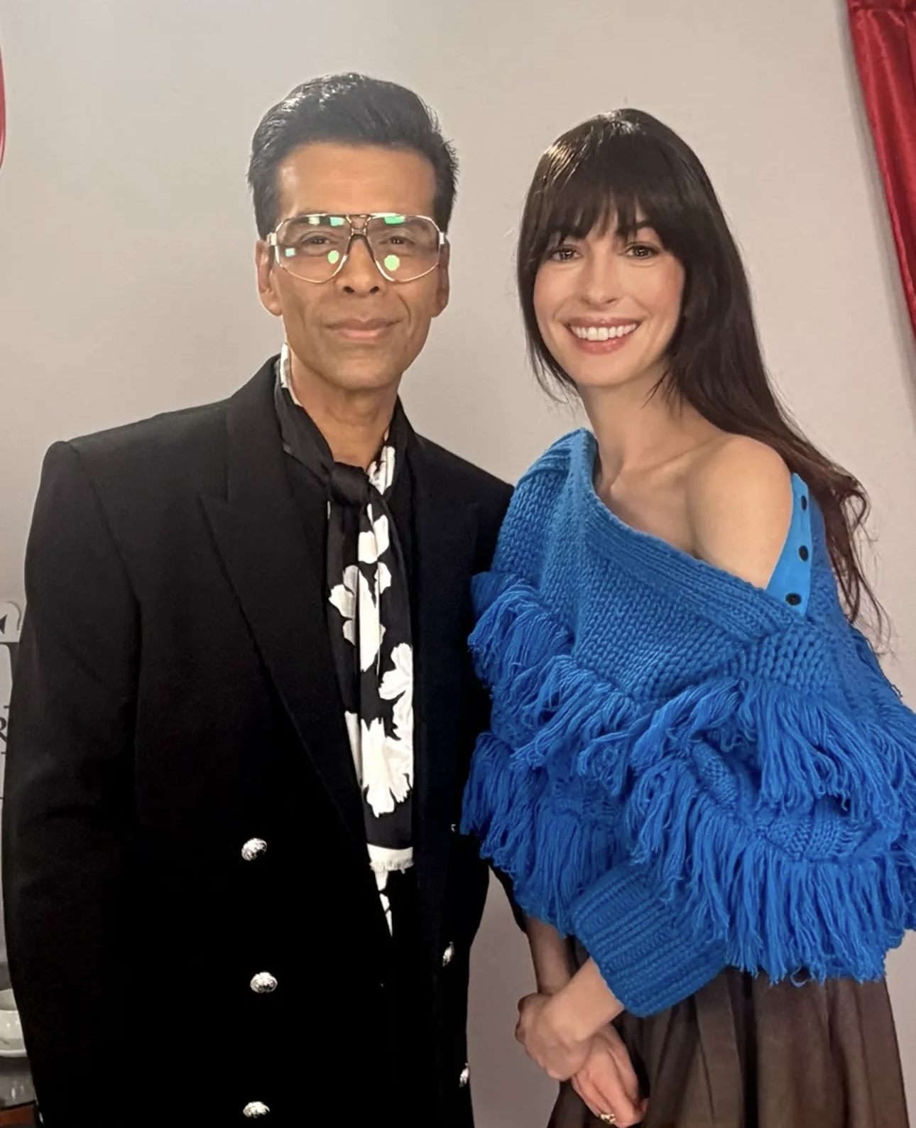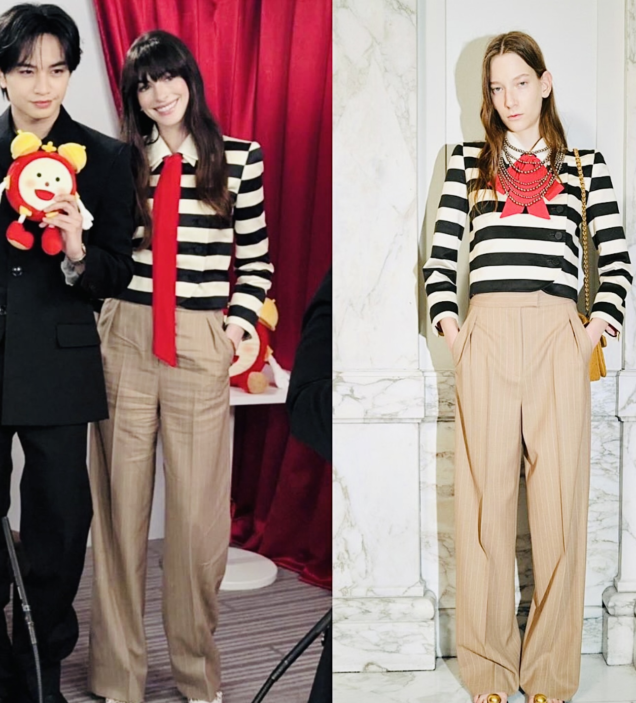 أمّا في المؤتمر الصحفيّ، فاختارت بدلة حمراء من “برادا” (Prada)، مؤلّفة من سروال بقصّة كلاسيكيّة وسترة “دوبتّي” مزدانة بأزرار كبيرة، وحدّدت خصرها بحزامٍ من الجلد بلون بيج داكن.