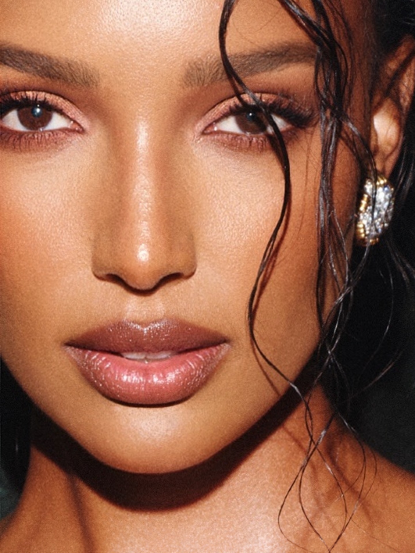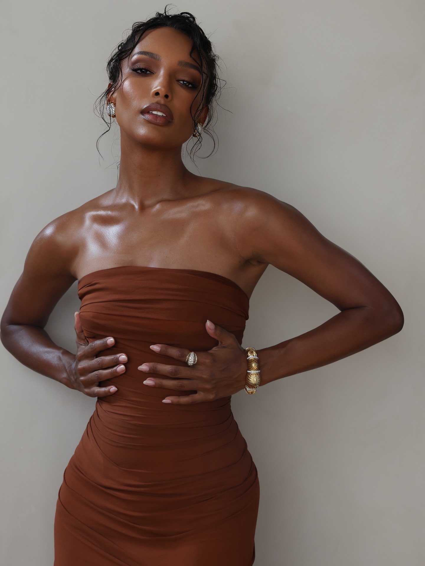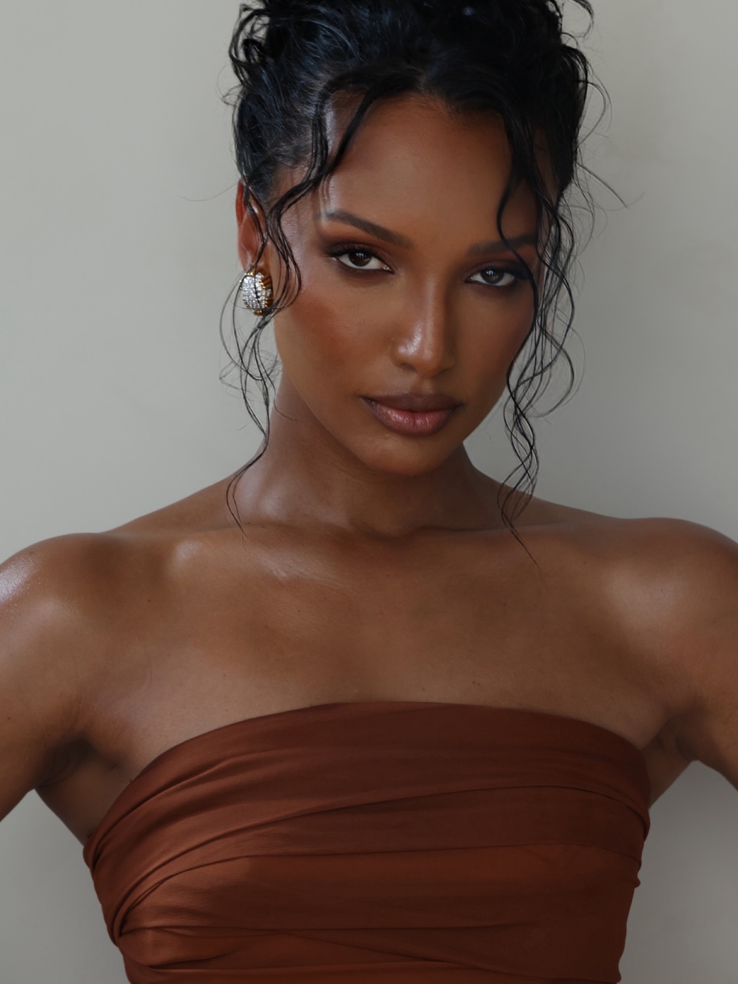 جمال جاسمين في هذه الإطلالة اعتمد على بشرة برونزية، مصقولة ومتوهّجة، فيما جاء مكياج الجفون بظلال ترابيّة دافئة ولمسة ماسكارا سوداء مع كحل أسود يحدّد خط الجفن الداخلي للعينين. وتمّ تغليف الشفتين بلون ماهوغاني فاتح ذي لمعة ناعمة بعد تحديدهما بقلم كونتور بنيّ. أمّا تسريحة الشعر فجاءت مرفوعة بنمط شينيون عفوي مع خصلات منسدلة حول الوجه، ما أضفى بعداً ناعماً وحسّاً عصرياً على الإطلالة المحسوبة بدقّة رغم أنها تبدو سهلة التنفيذ.