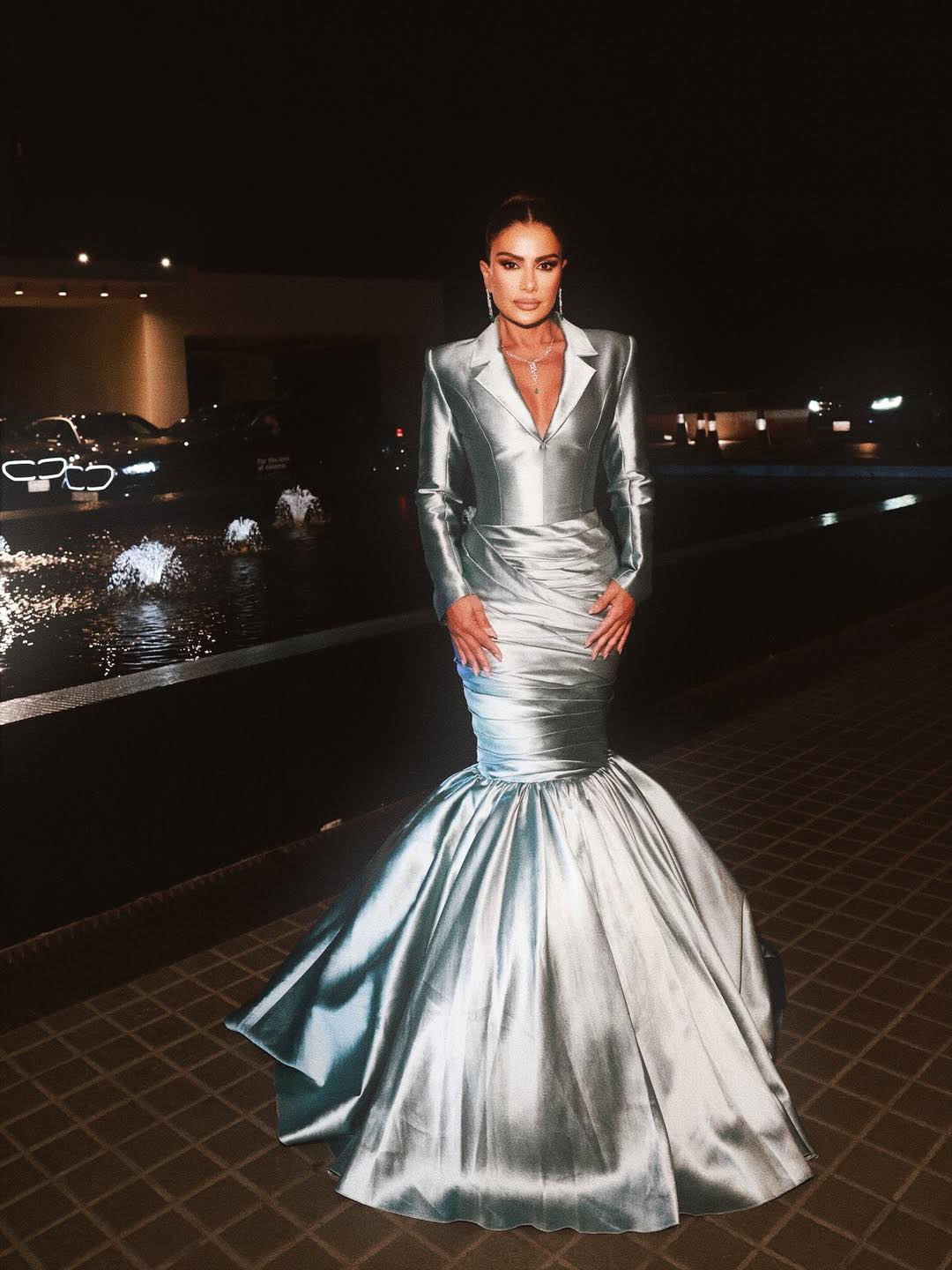 عادت صبا لتوهجها مع جورج حبيقة في ثوب سكري طويل تميز بقماشه الشفاف وتطريزاته الدقيقة. القصة المكشوفة (Cut out) عند الخصر والظهر أبرزت رشاقتها المعهودة، مما جعلها واحدة من أجمل إطلالات المهرجانات.
