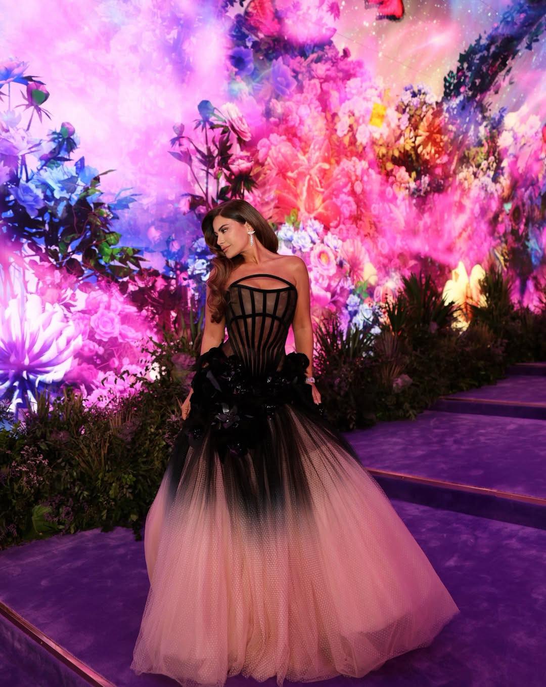 في حفل “جوي أواردز”، قدمت صبا درساً في “دراما الأزياء” بتوقيع أنطوان القارح. أطلت بثوب فضفاض ضخم يعتمد على تقنية “الجيب” التي منحت التنورة ثباتاً معمارياً لافتاً. التباين بين سواد الكورسيه المشدود ونعومة الورد الزهري عند الخصر والحواف، خلق توازناً مذهلاً بين الجرأة والأنوثة الطاغية.