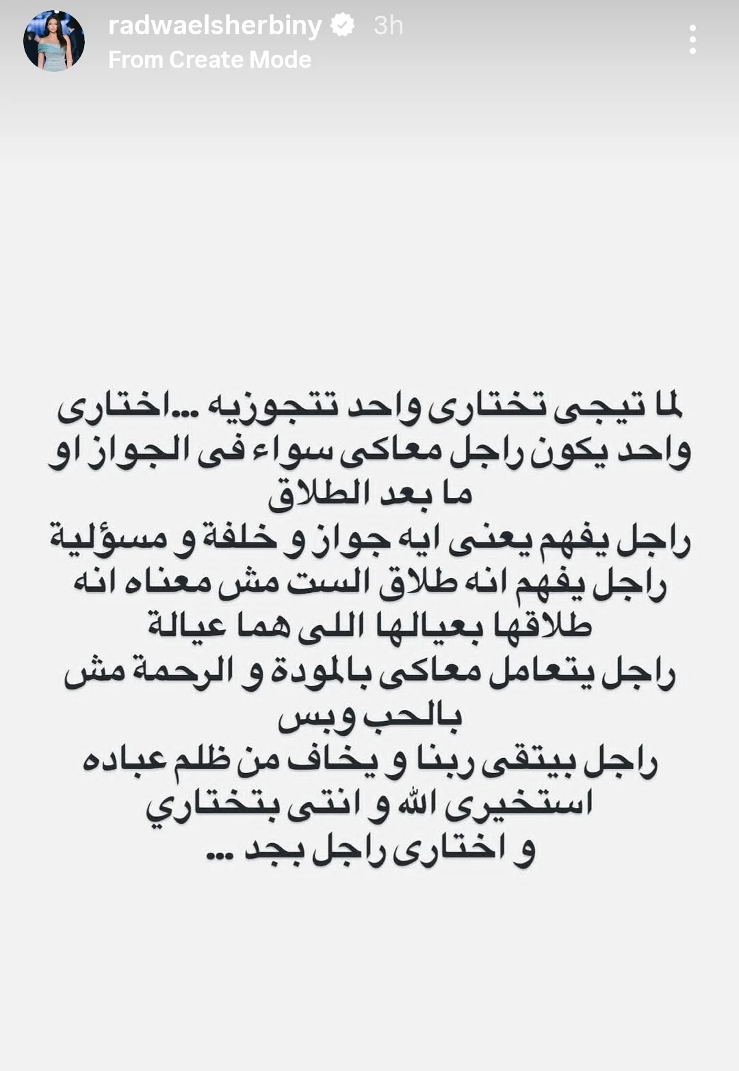 وأضافت: “اختاري راجل يفهم إنه طلاق الست مش معناه إنه طلاقها بعيالها اللي هما عياله، راجل يتعامل معاكي بالمودة والرحمة مش بالحب وبس، راجل بيتقي ربنا ويخاف من ظلم عباده، اختاري راجل بجد”.