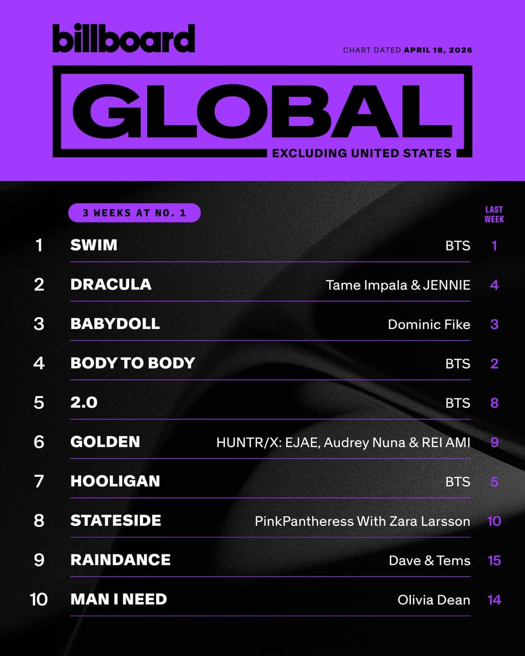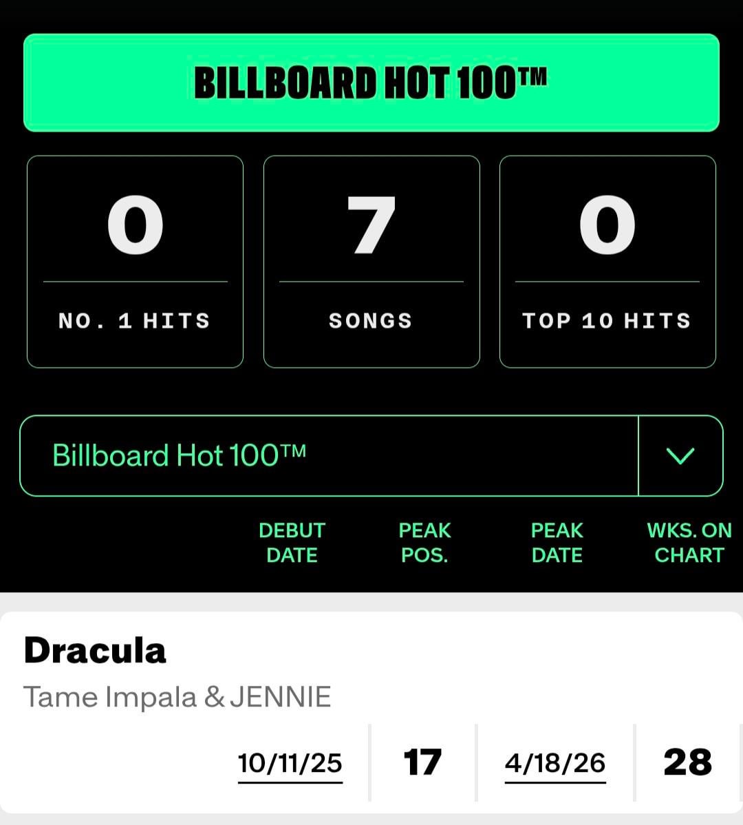 260407 Tame Impala & JENNIE - يصل "Dracula" إلى قمم جديدة في المركز الثالث على Billboard Global 200، والمركز الثاني على Billboard Global Excl. الولايات المتحدة ورقم 17 في قائمة Billboard Hot 100!