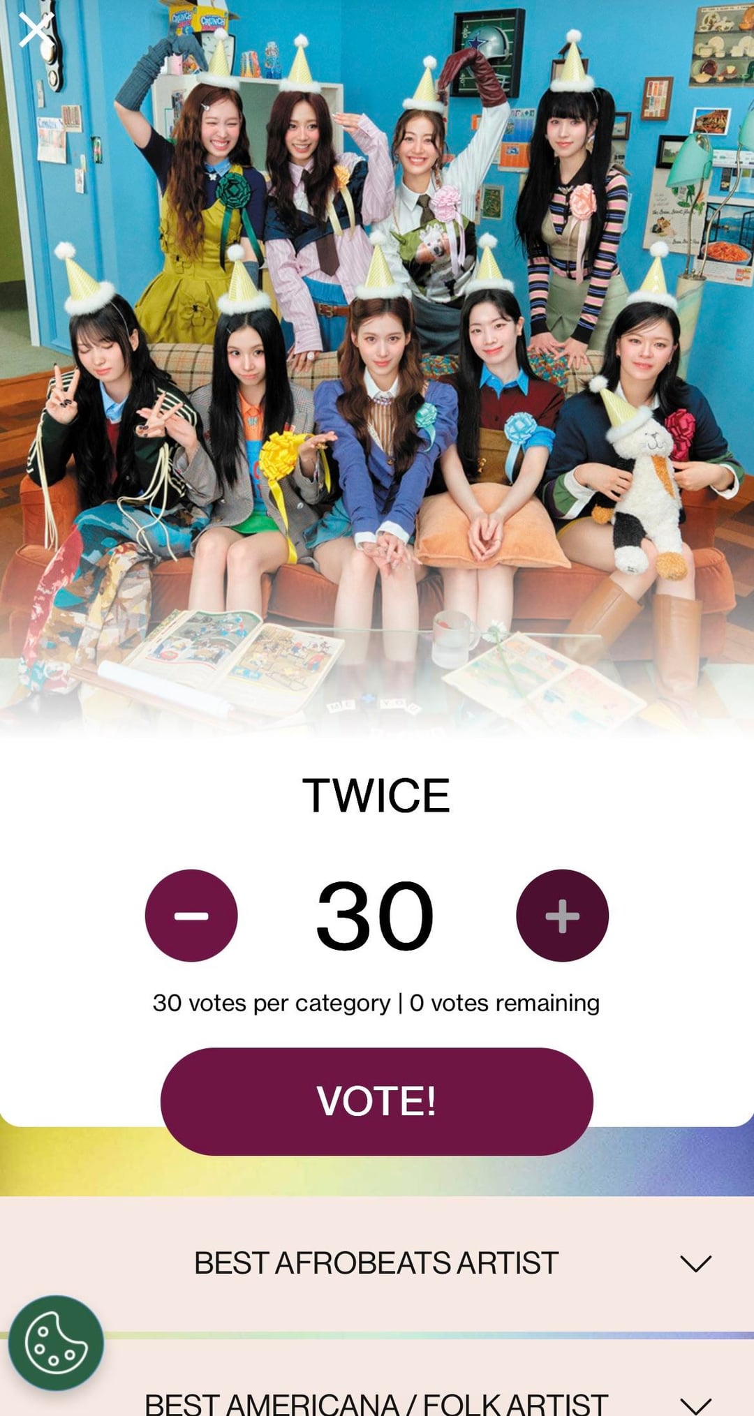 مرة واحدة نحتاج إلى التصويت لصالح توايس. الفتيات يعملن بجد ويستحقن ذلك. يمكننا الفوز إذا صوتنا بقدر ما نستطيع!!! كل ما عليك فعله هو تسجيل الدخول باستخدام البريد الإلكتروني واستخدام 30 صوتًا لـ Twice كل يوم. يمكنك إنشاء العديد من الحسابات كما تريد. يمكنك أيضًا التصويت على ig. تذهب إلى صفحة AMAs على ig وتحت المنشور قم بالتعليق على الهاشتاج #femalekpoptwice. كل صوت مهم
