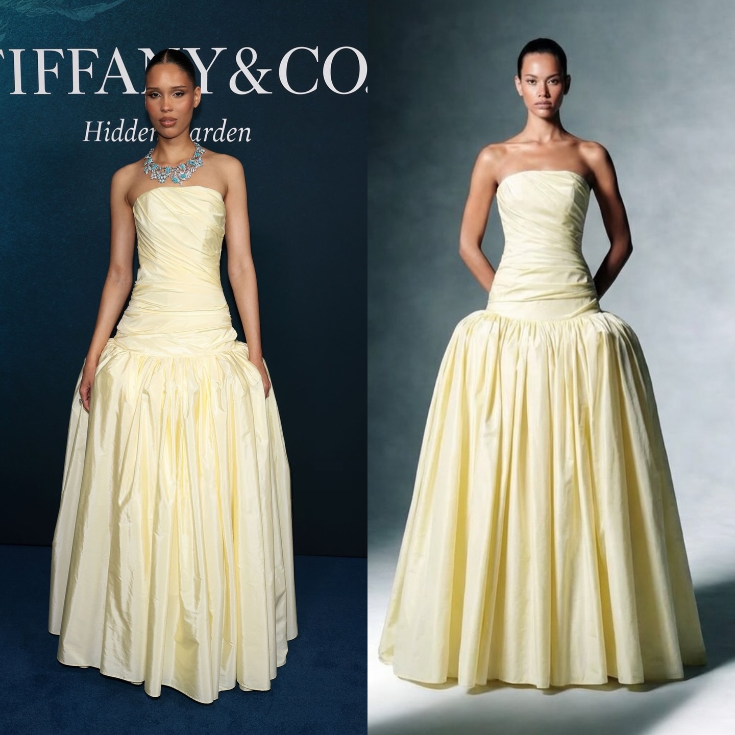 تميّز الفستان بقصّة طويلة بدون حمّالات، وبخصر منحوت وتنّورة منفوخة، مع تفاصيل الزمزمة والطيّات الناعمة.