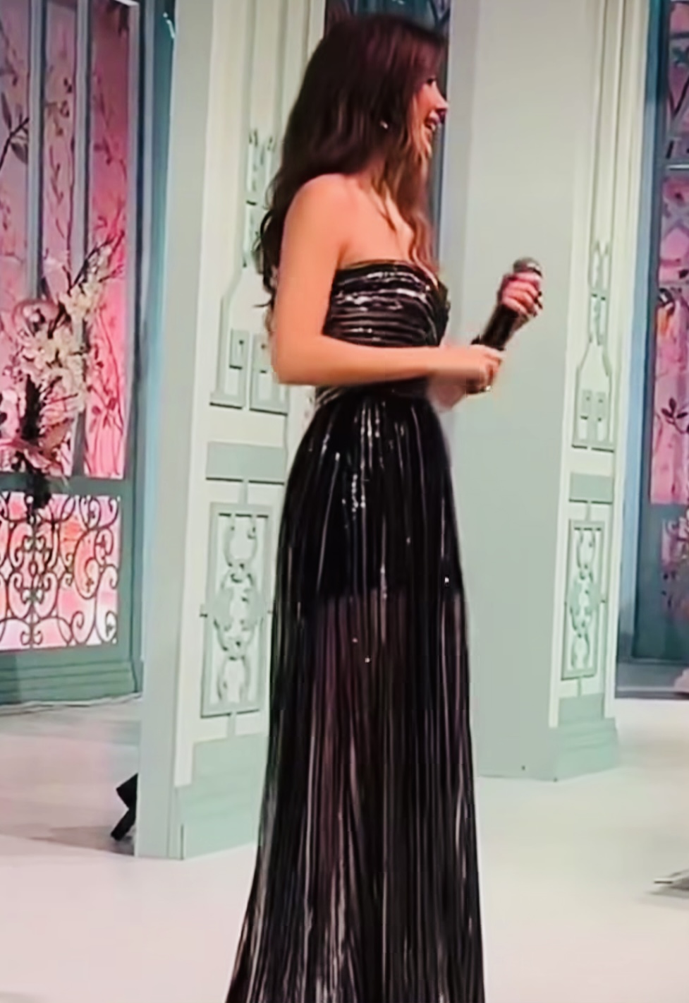 تميّز الفستان الشفّاف بقصّة طويلة منسدلة بدون حمّالات Strapless، بتفصيل الثنيات والزمزمة الناعمة عند الصدر، “كورسيه” داخليّ مهيكل، وخصر منحوت. هذا النمط من الفساتين يُشكّل إحدى القصّات الأكثر رواجاً في فساتين السّهرات هذا الصيف، وهو مقرون بسروال أسود قصير يظهر جلياً من خلال النسيج الشفاف.