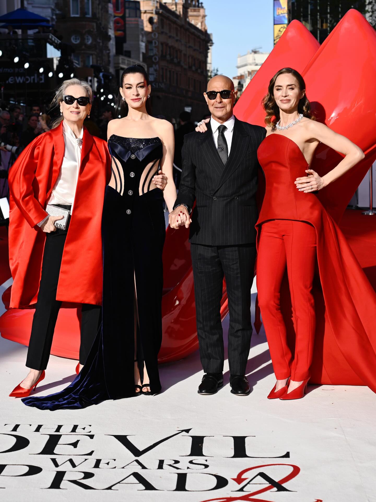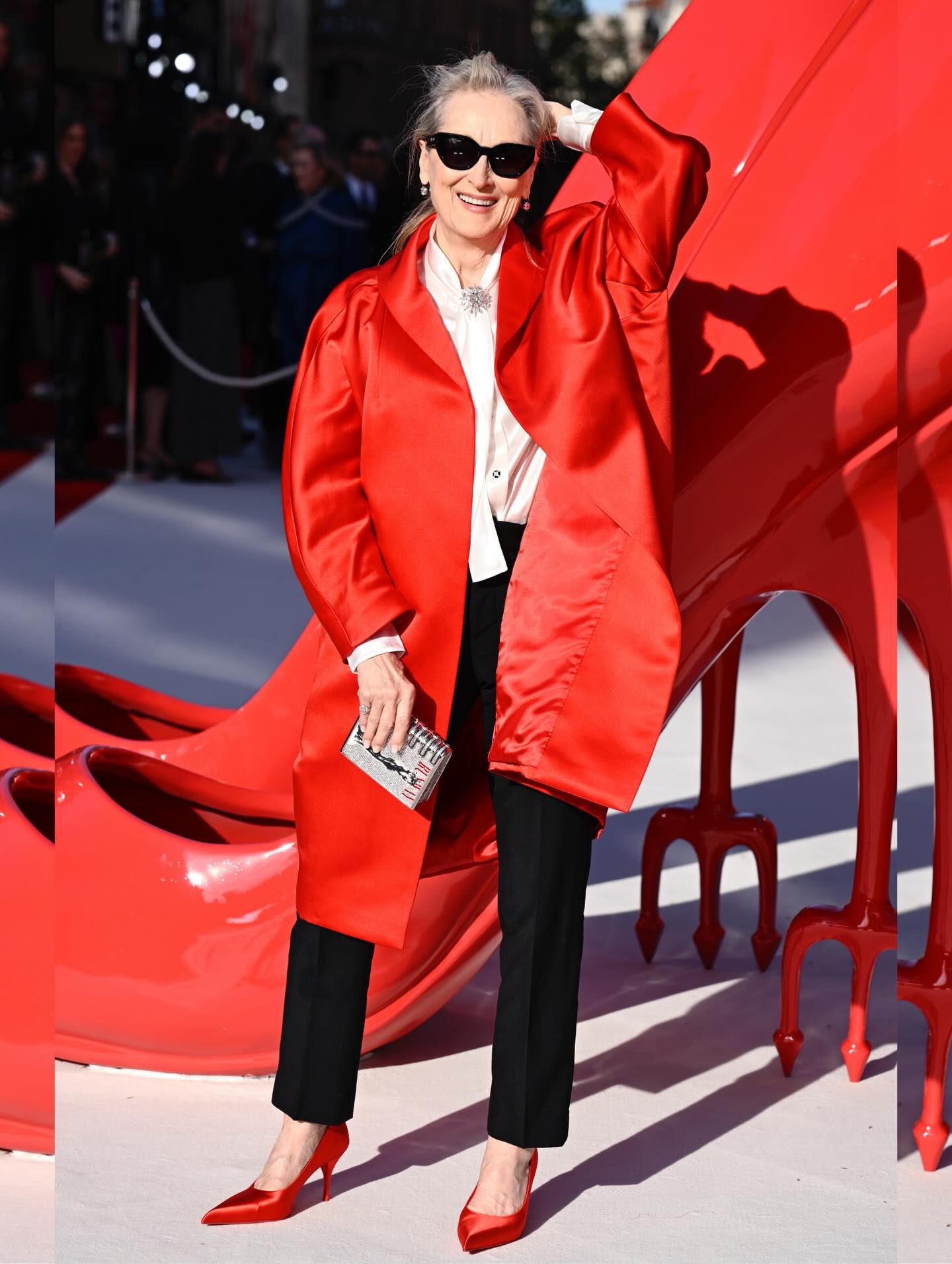 أما ميريل ستريب، فقد أعادت إلى الواجهة هالة “ميراندا بريستلي”، بمعطف أحمر فاخر من Prada فوق قميص حريري وبنطال أسود كلاسيكي.